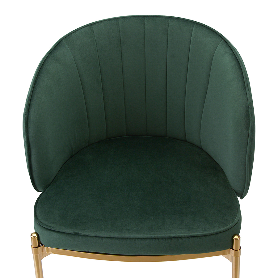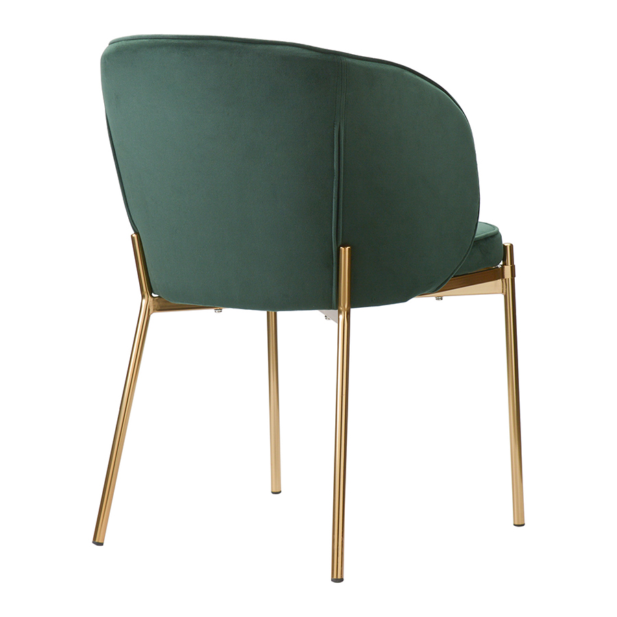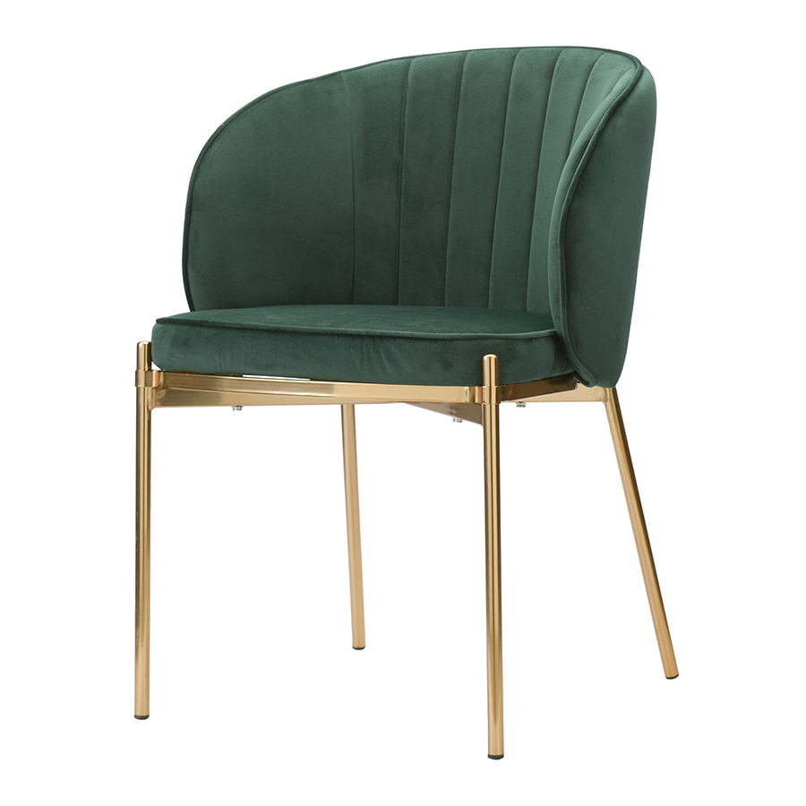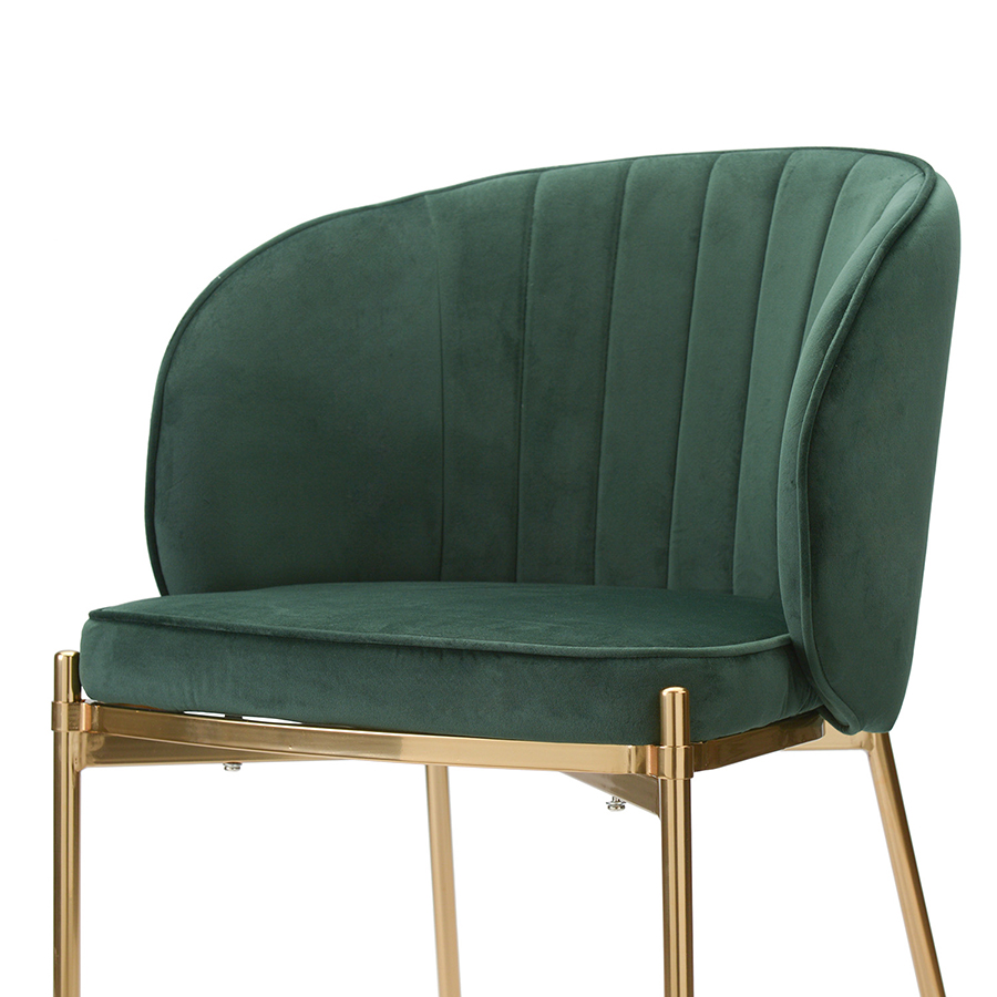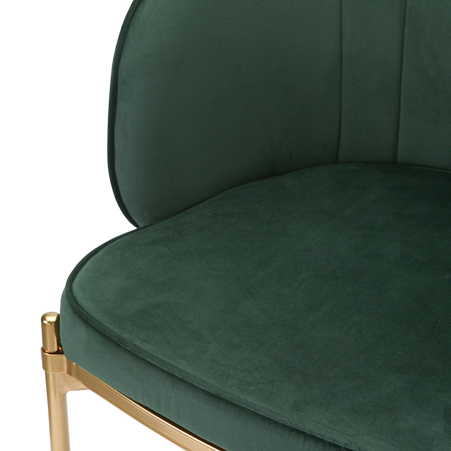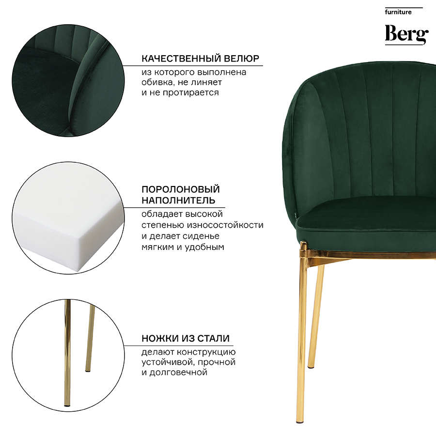 Комфорт во время отдыха на стуле создается за счет мягкого сиденья с наполнителем из пенополиуретана и высокой закругленной спинки. Обивка из бархатистого велюра, украшенная декоративной строчкой, придает модели особый шарм. Эстетический потенциал материала настолько высок, что ему сложно найти конкурентов. Помимо презентабельного вида и приятных тактильных ощущений, ткань обладает хорошими эксплуатационными характеристиками, такими как прочность, износоустойчивость и долговечность. Ножки мебели выполнены из стали, что обеспечивает конструкции надежность и защиту от коррозии.