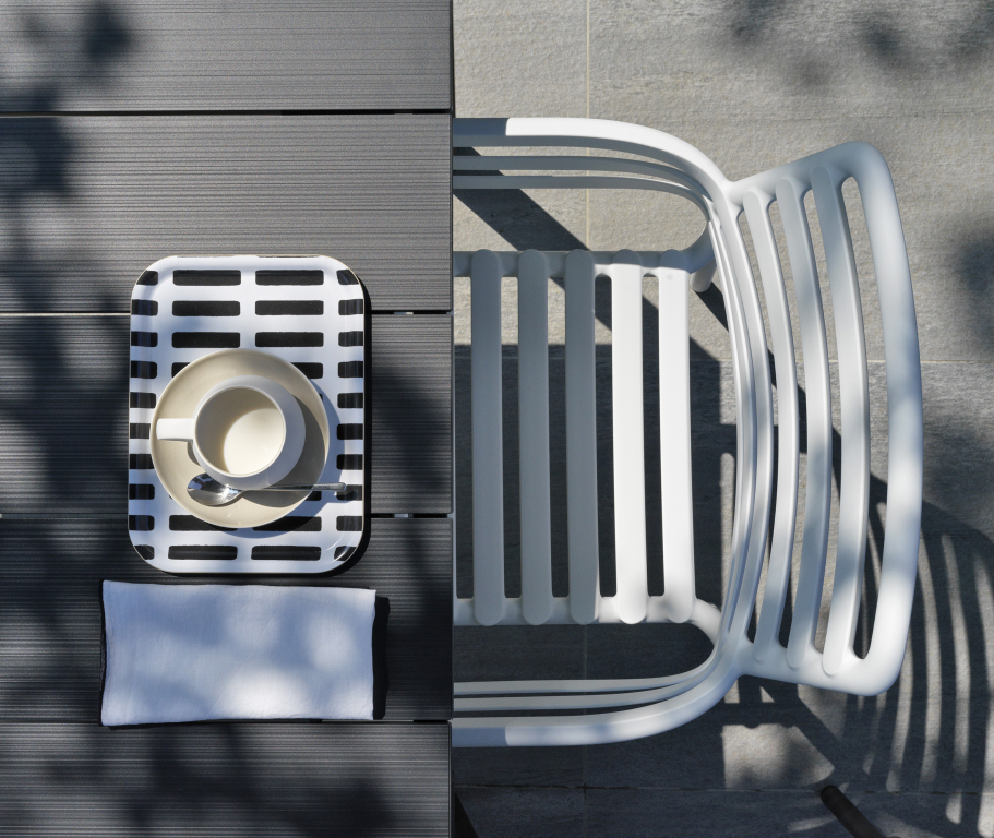 Свежая, легкая и эргономичная, Doga - это новая очаровательная коллекция уличной мебели: Кресла с подлокотниками и без них, кресло для отдыха и моноблочный журнальный столик из стеклопластика (полипропилен и стекловолокно). Вся коллекция была вдохновлена решетчатым дизайном, но Рафаэлло Галиотто, ее дизайнер, придал ей современный оттенок. Плавные линии спинки и сиденья стульев характеризуются игрой заполнений и пустот, отмеченных последовательностью горизонтальных планок.