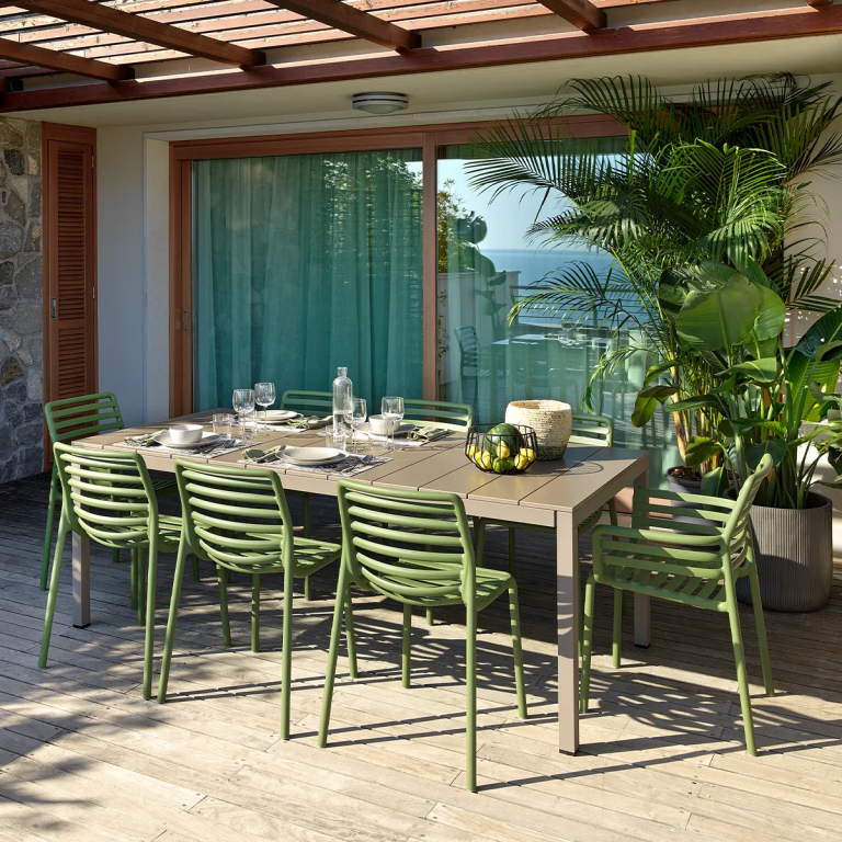 Свежая, легкая и эргономичная, Doga - это новая очаровательная коллекция уличной мебели: Кресла с подлокотниками и без них, кресло для отдыха и моноблочный журнальный столик из стеклопластика (полипропилен и стекловолокно). Вся коллекция была вдохновлена решетчатым дизайном, но Рафаэлло Галиотто, ее дизайнер, придал ей современный оттенок. Плавные линии спинки и сиденья стульев характеризуются игрой заполнений и пустот, отмеченных последовательностью горизонтальных планок.