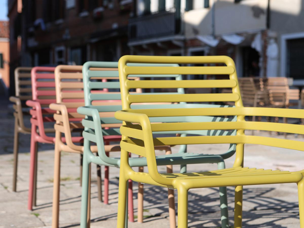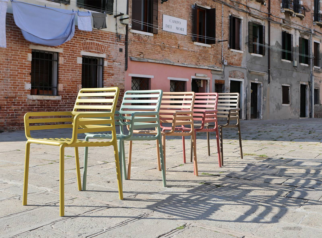 Свежая, легкая и эргономичная, Doga - это новая очаровательная коллекция уличной мебели: Кресла с подлокотниками и без них, кресло для отдыха и моноблочный журнальный столик из стеклопластика (полипропилен и стекловолокно). Вся коллекция была вдохновлена решетчатым дизайном, но Рафаэлло Галиотто, ее дизайнер, придал ей современный оттенок. Плавные линии спинки и сиденья стульев характеризуются игрой заполнений и пустот, отмеченных последовательностью горизонтальных планок.