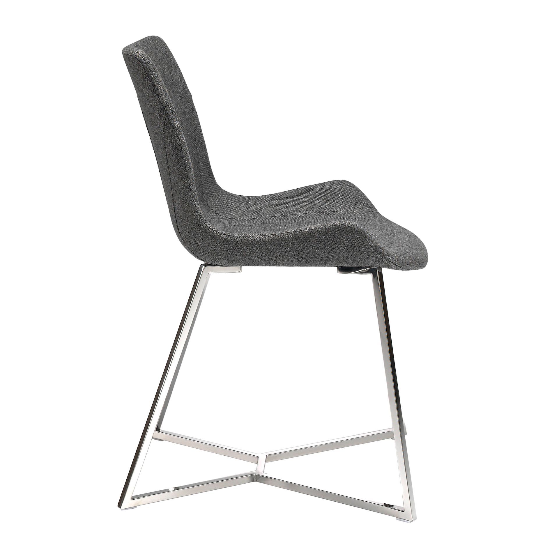 Стул с ножками из нержавеющей стали и сиденьем, обитым тканью.
