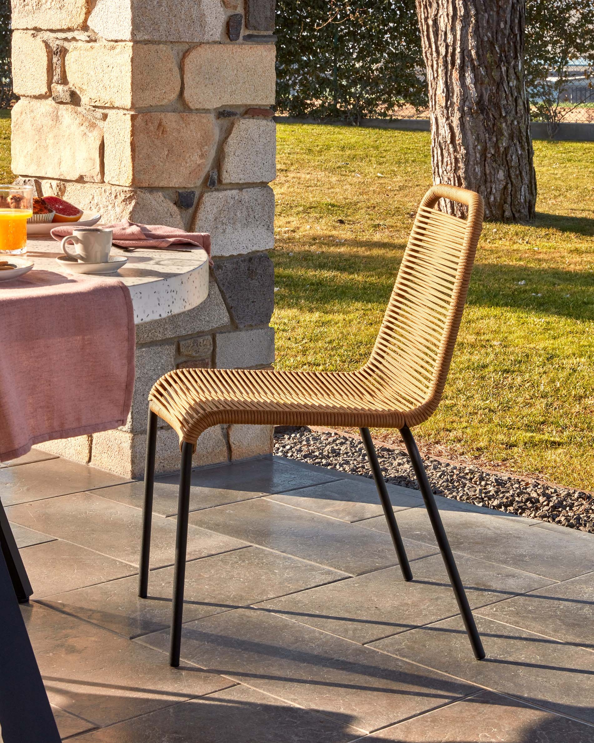 Стул Glenville от фабрики La Forma – удобный и гибкий предмет уличной мебели, созданный из прочного каната. Стул Glenville впечатляет своим авторским исполнением с первого взгляда. Его плетеное сиденье смотрится удивительно оригинально и интересно. Использованный шнур позволит принять телу максимально расслабленное положение. А его прочность не даст беспокоиться о надежности этого изделия. Добавьте стиля в ваше открытое пространство вместе с Glenville. Стул состоит из металлического каркаса и плетеного сиденья из прочного полимерного шнура (95% полипропилен, 5% полиэстер). Сверху есть специальное покрытие, которое защищает нити от вредного воздействия ультрафиолета. В зависимости от выбранной модели, цвет шнура может быть бежевым, белым, чёрным. Каркас сделан из оцинкованной стали. Поверхность покрыта черной порошковой краской, которая защищает металл от негативного воздействия влаги. Ножки высотой 45 см имеют трубчатую структуру, оснащены пластиковыми наконечниками, которые обеспечивают устойчивость на неровной поверхности. Максимальная весовая нагрузка – 130 кг. Размеры: ширина – 49 см, высота – 84 см, глубина – 59 см, глубина сиденья – 44 см. Вес – 3 кг. Сборка не требуется.