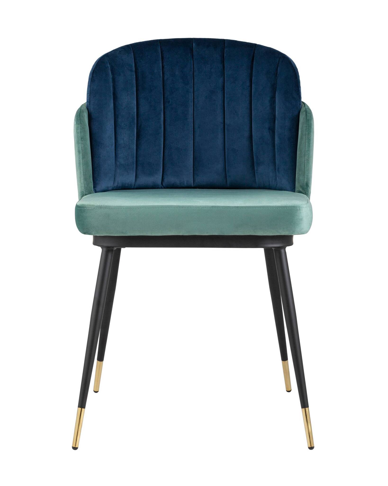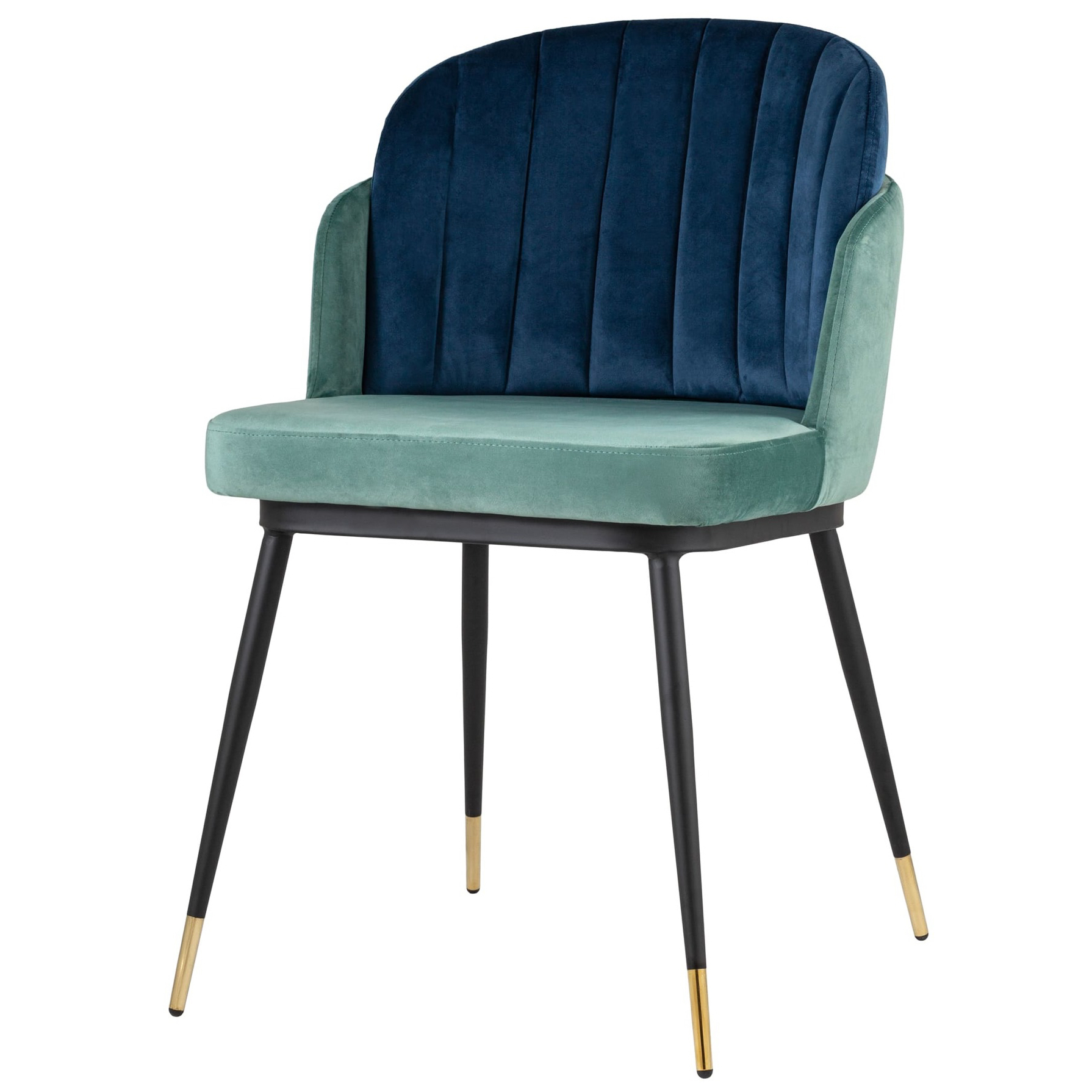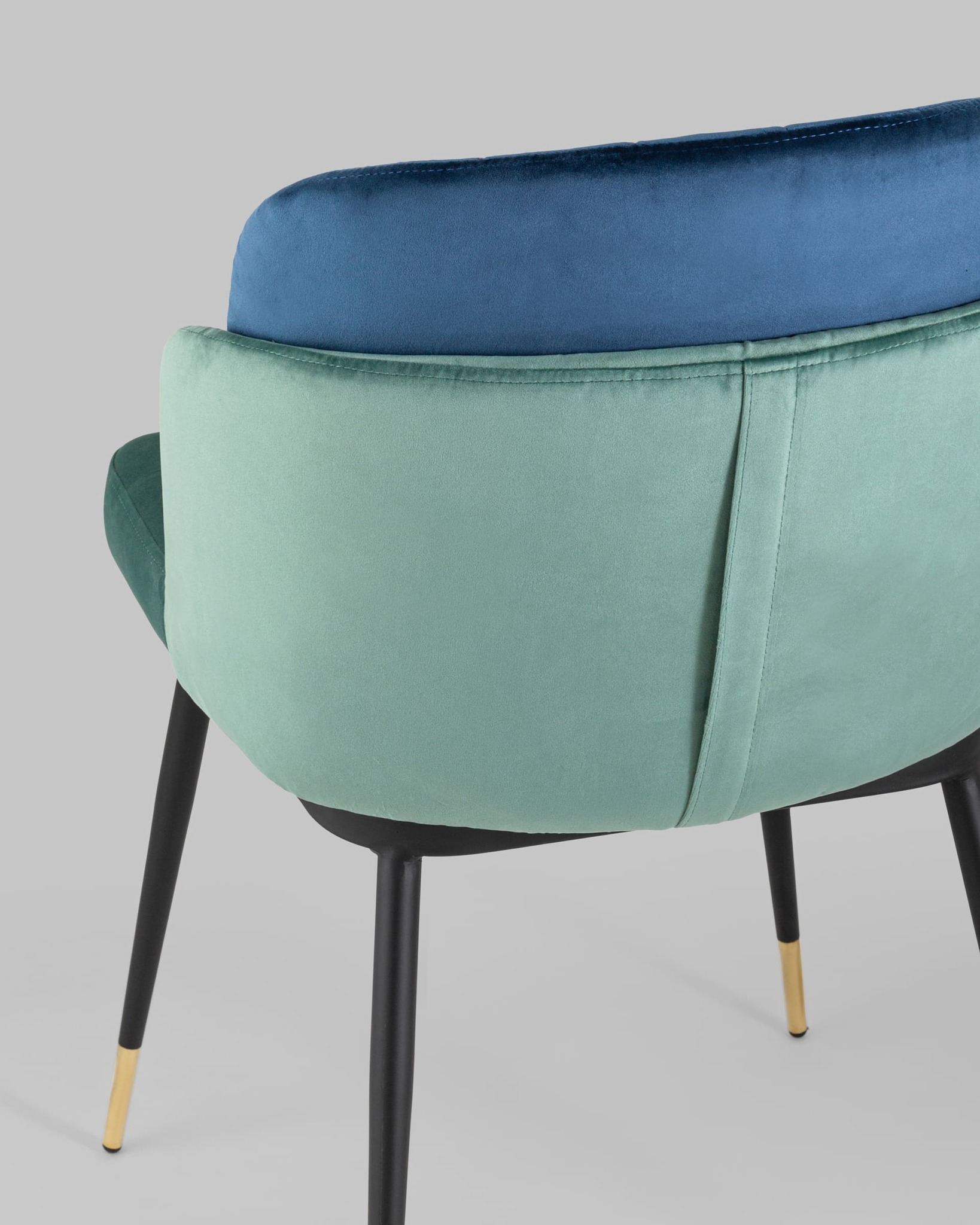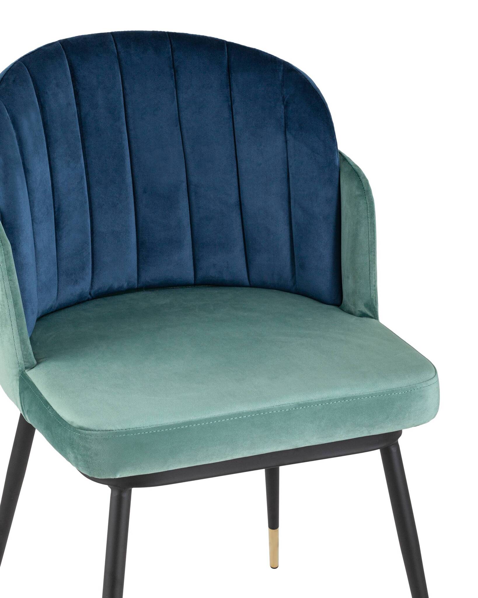 Мягкий двухцветный кухонный стул с обивкой из велюра. Надежная опора достигается благодаря металлическому каркасу и удобным устойчивым ножкам, красиво украшенным золотом. Спинка состоит из двух элементов, внутренняя часть с вертикальной строчкой.