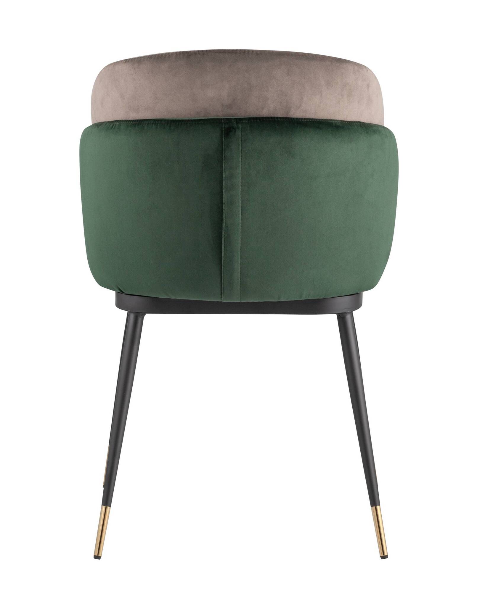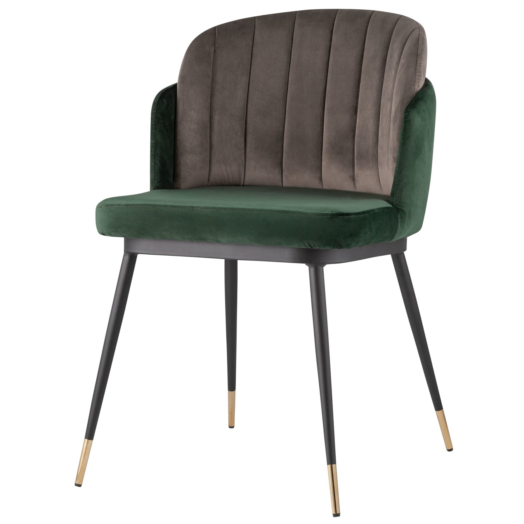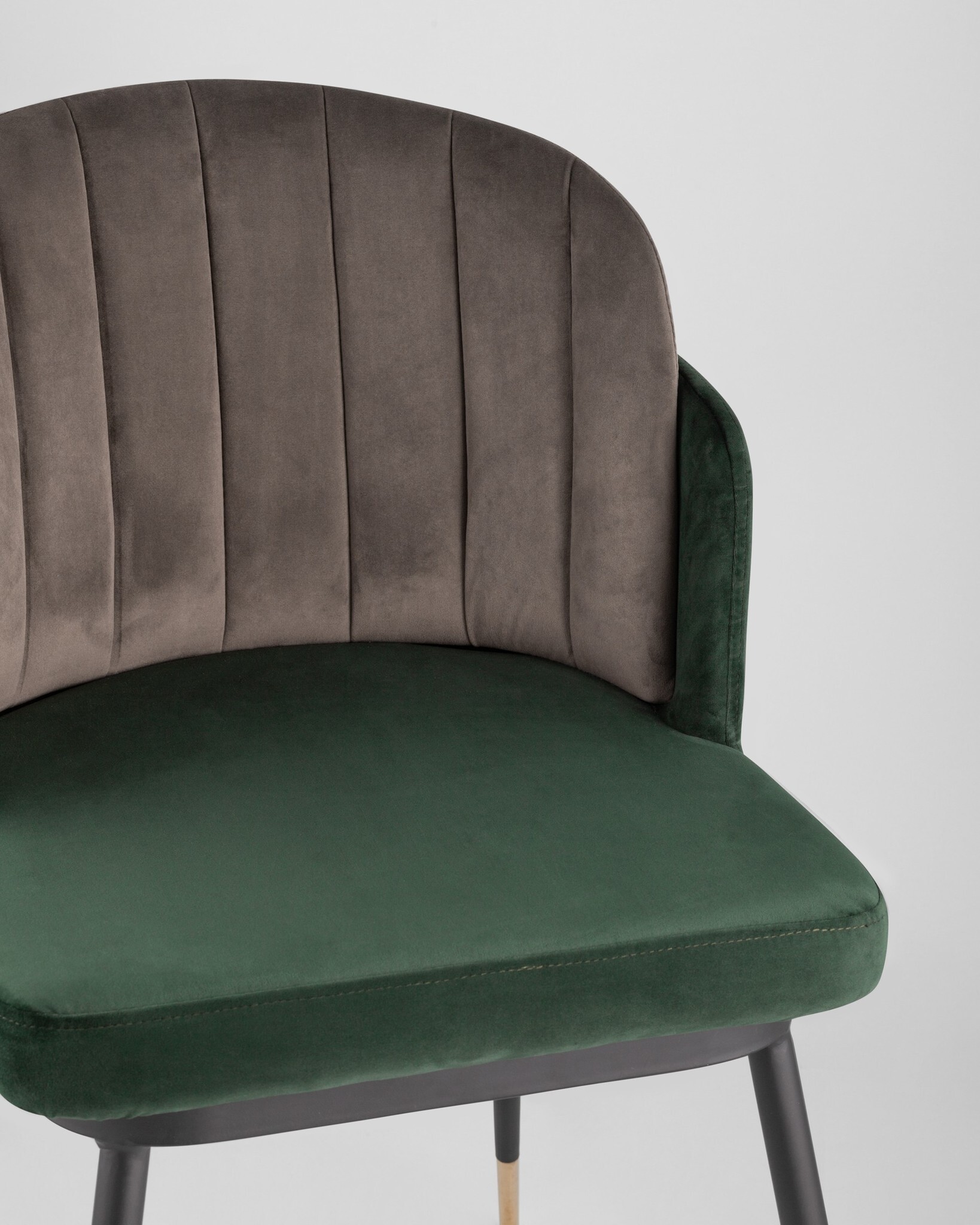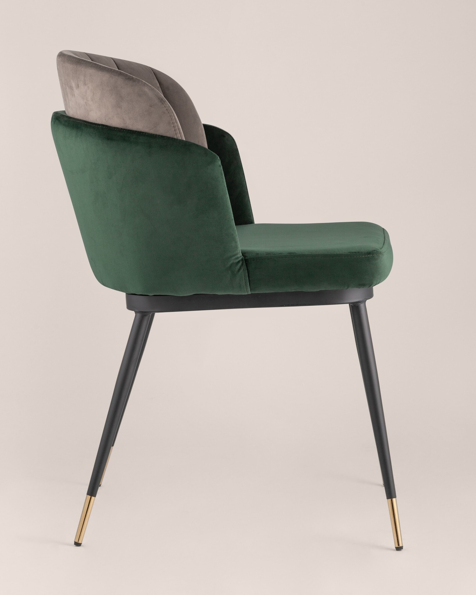 Мягкий двухцветный кухонный стул с обивкой из велюра. Надежная опора достигается благодаря металлическому каркасу и удобным устойчивым ножкам, красиво украшенным золотом. Спинка состоит из двух элементов, внутренняя часть с вертикальной строчкой.