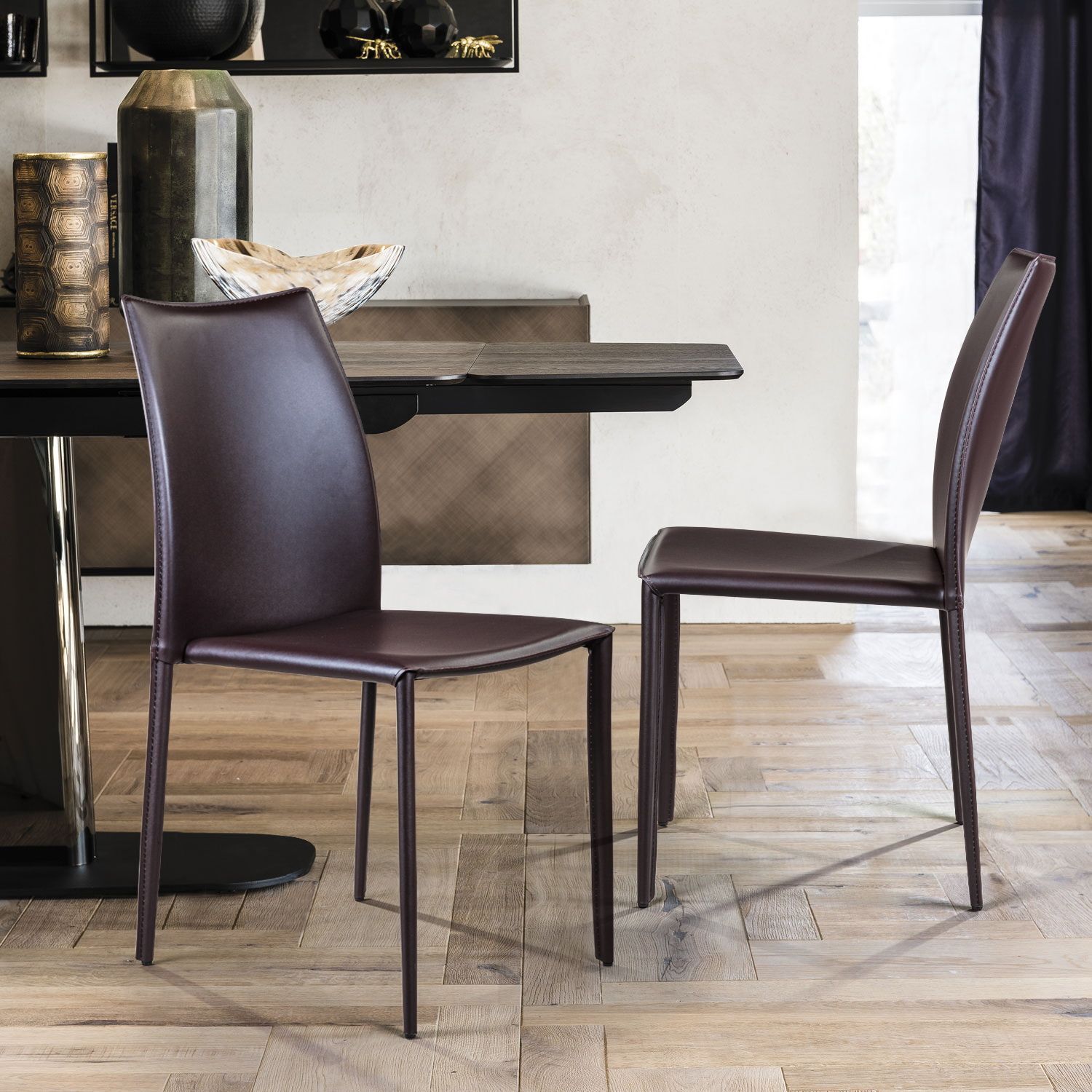 Крепкие металлические ножки скрыты под натуральной кожей такого же цвета, как и сам стул, благодаря этому создается лаконичный образ единого целого. На ножках предусмотрены специальные пластиковые накладки, которые придают стулу дополнительную устойчивость и защищают пол от царапин.