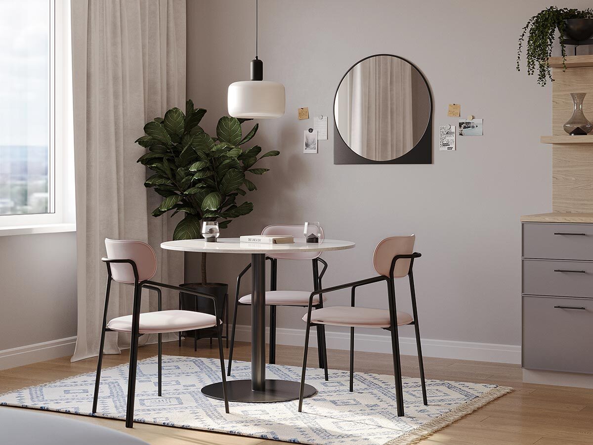 Коллекция Ror - это мебель с индивидуальным характером. Каркас стула Round состоит из трех стремящихся вверх элементов, которые образуют округлый, словно окутывающий корпус. За счет отсутствия прямых углов создается легкий, гармоничный силуэт. Стальное основание с порошковым покрытием делает конструкцию прочной и надежной, а мягкий велюр с бархатистой текстурой обеспечивает тактильный комфорт. Ткань обивки обладает высокими показателями износостойкости. Используемый пенополиуретан отличается комфортной плотностью и жесткостью. Все материалы отвечают высоким стандартам практичности, долговечности и экологической безопасности. Стул украсит собой любой современный интерьер: подойдет для оформления обеденной группы, рабочего пространства или зоны отдыха. Материалы: сталь, фанера, 100% пенополиуретан, 100% полиэстер. Размеры: 56,9х48,6х83 см. Максимальная нагрузка: 102 кг. Цвет: черный/розовый. Загрязнения удалять с поверхностей мыльным раствором воды при помощи мягкой губки или салфетки.