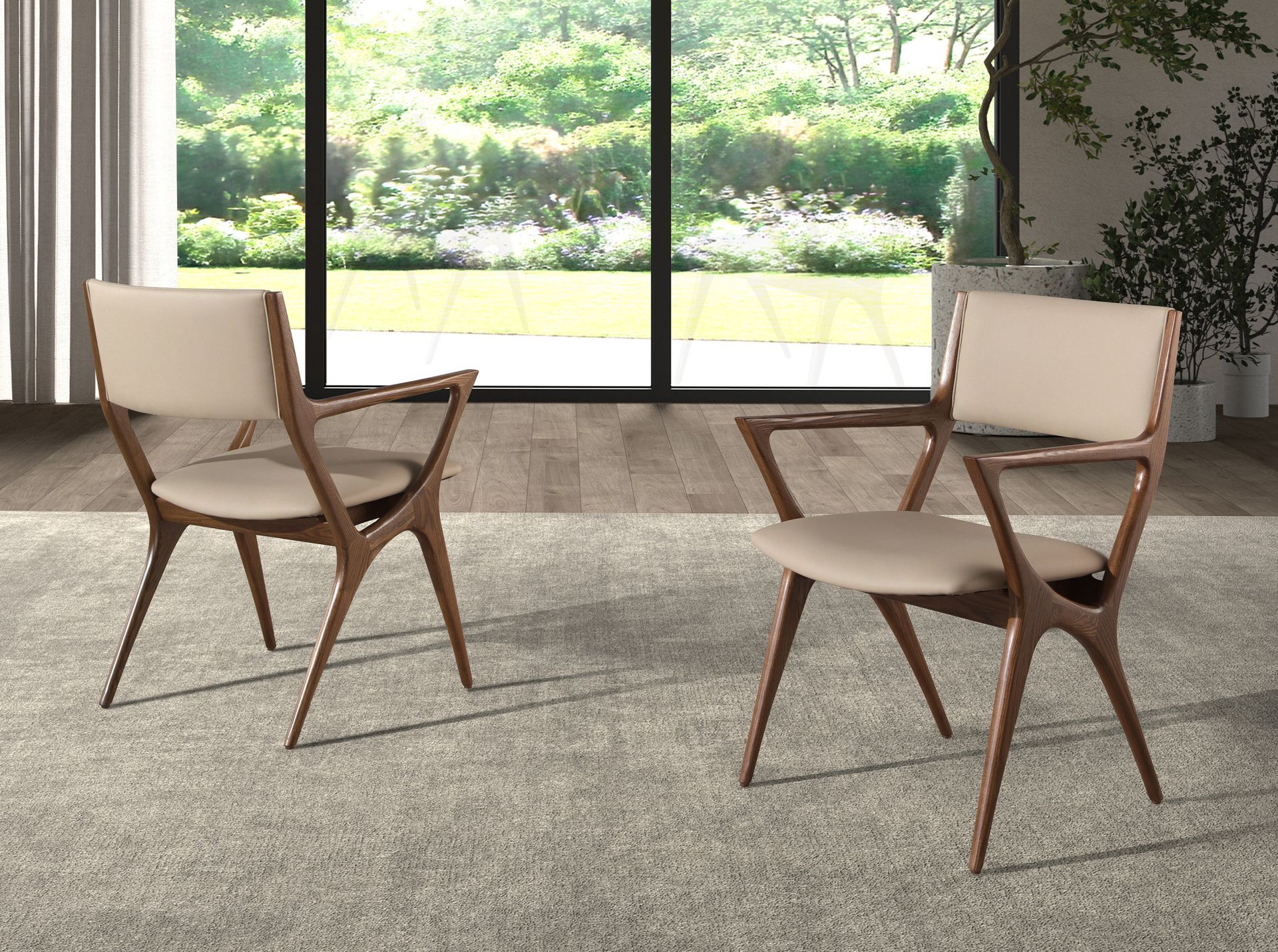 Стул с подлокотниками в современном дизайне, с сиденьем и спинкой, обитыми кожзаменителем цвета норки. Его деревянные ножки орехового цвета в авангардном, но неподвластном времени стиле сделают его незаменимым предметом мебели для вашей кухни или столовой. Этот стул от Angel Cerdá сочетает в себе уникальный и индивидуальный стиль бренда, а также максимальный комфорт и устойчивость благодаря высокому качеству обивки и оригинальной конструкции ножек.