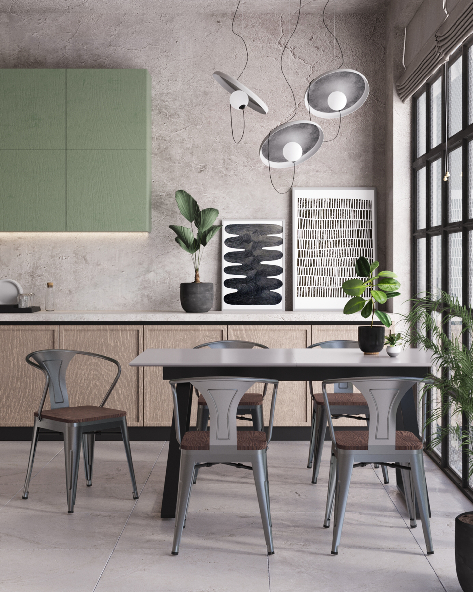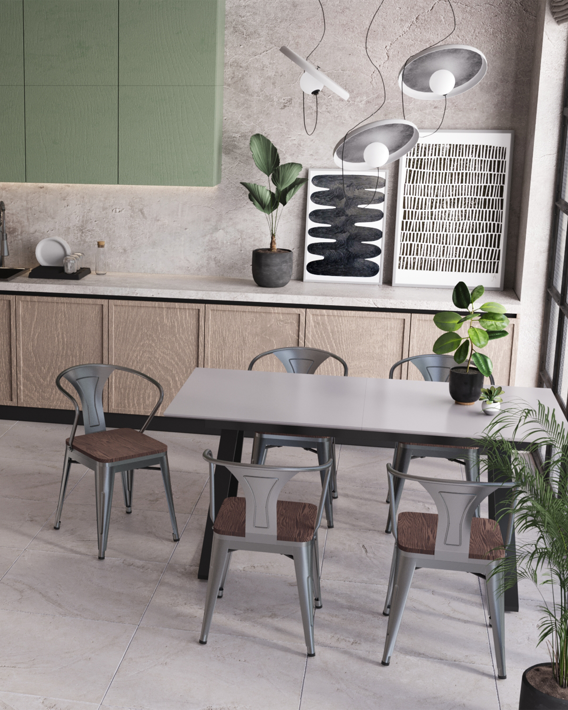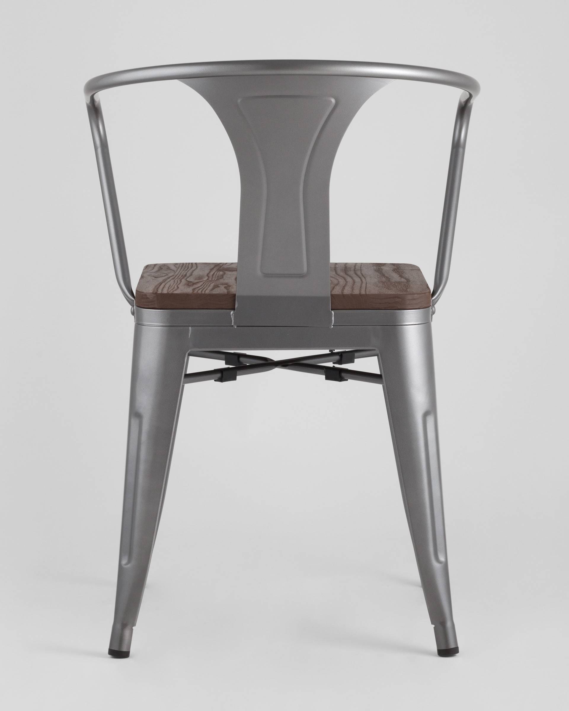 Стул Stool Group TOLIX с подлокотниками серебристый матовый + темное дерево, металлическое серебристое основание, оцинкованный металл с порошковым напылением, сиденье из натурального дерева