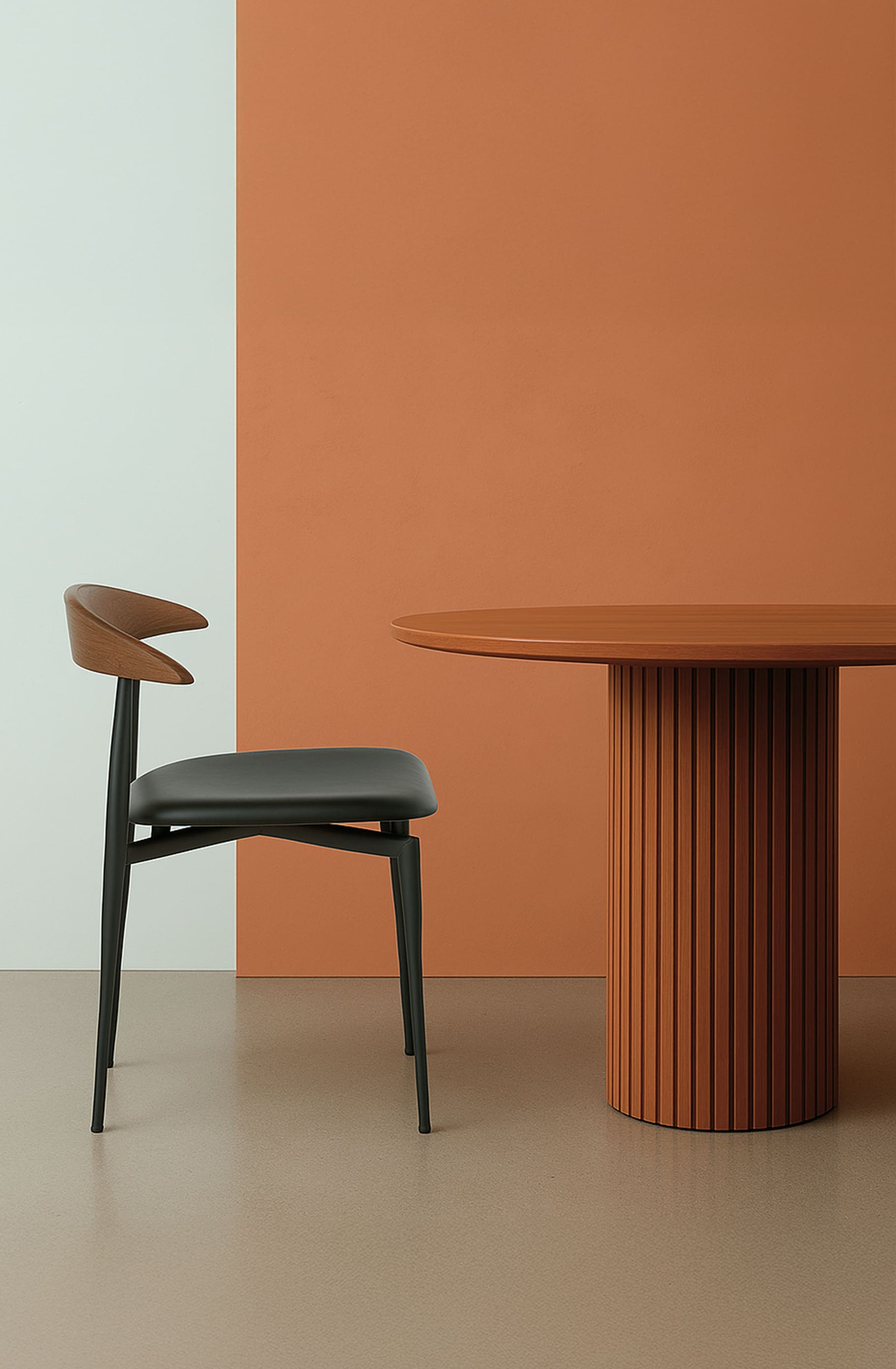 Матовый черный стальной каркас подчеркивает его современный характер, а спинка из массива ореха добавляет нотку тепла и природной элегантности. Черное сиденье из полиуретана и поливинилхлорида обеспечивает комфорт и легкость в уходе.