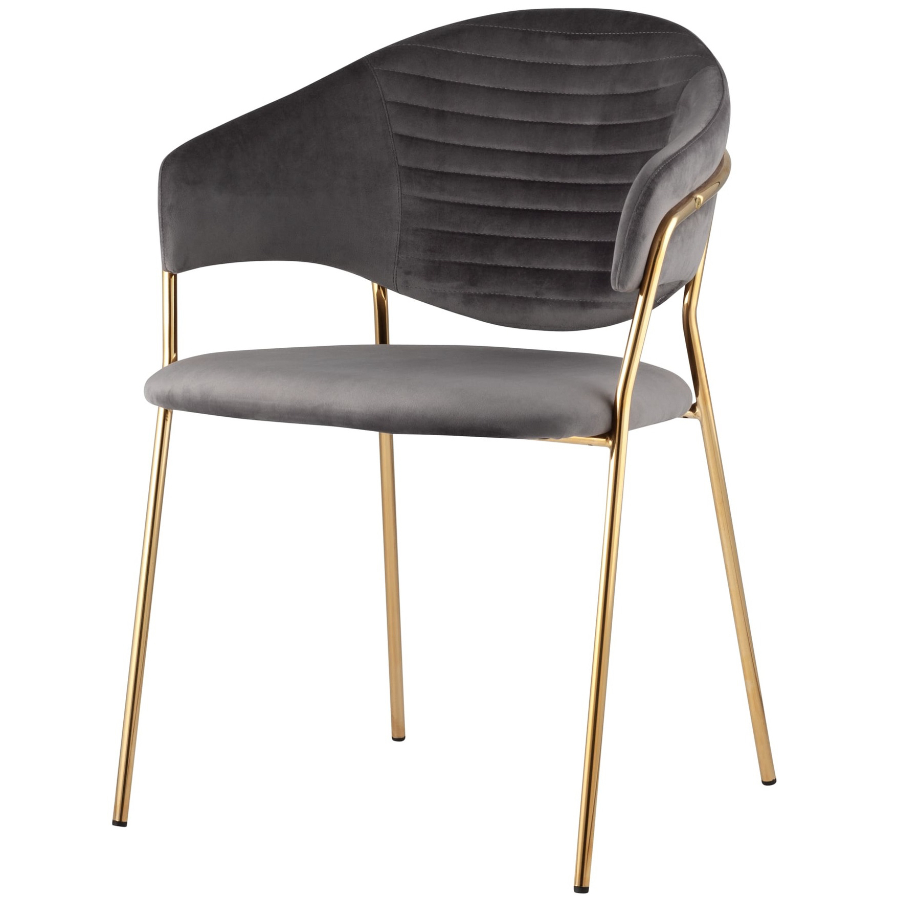 Стильный кухонный стул с оригинальной формой спинки, высокой поддержкой и подлокотниками. В качестве обивки используется мягкий велюр. Металлический каркас золотого цвета огибает спинку и выступает аккуратным акцентом модели. Широкое сиденье обеспечивает удобную посадку и уют.