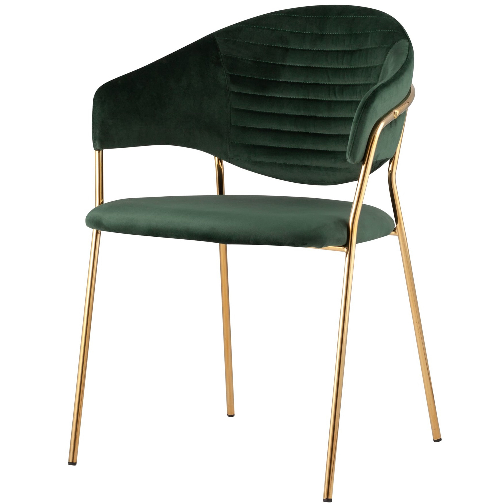 Стильный кухонный стул с оригинальной формой спинки, высокой поддержкой и подлокотниками. В качестве обивки используется мягкий велюр. Металлический каркас золотого цвета огибает спинку и выступает аккуратным акцентом модели. Широкое сиденье обеспечивает удобную посадку и уют.