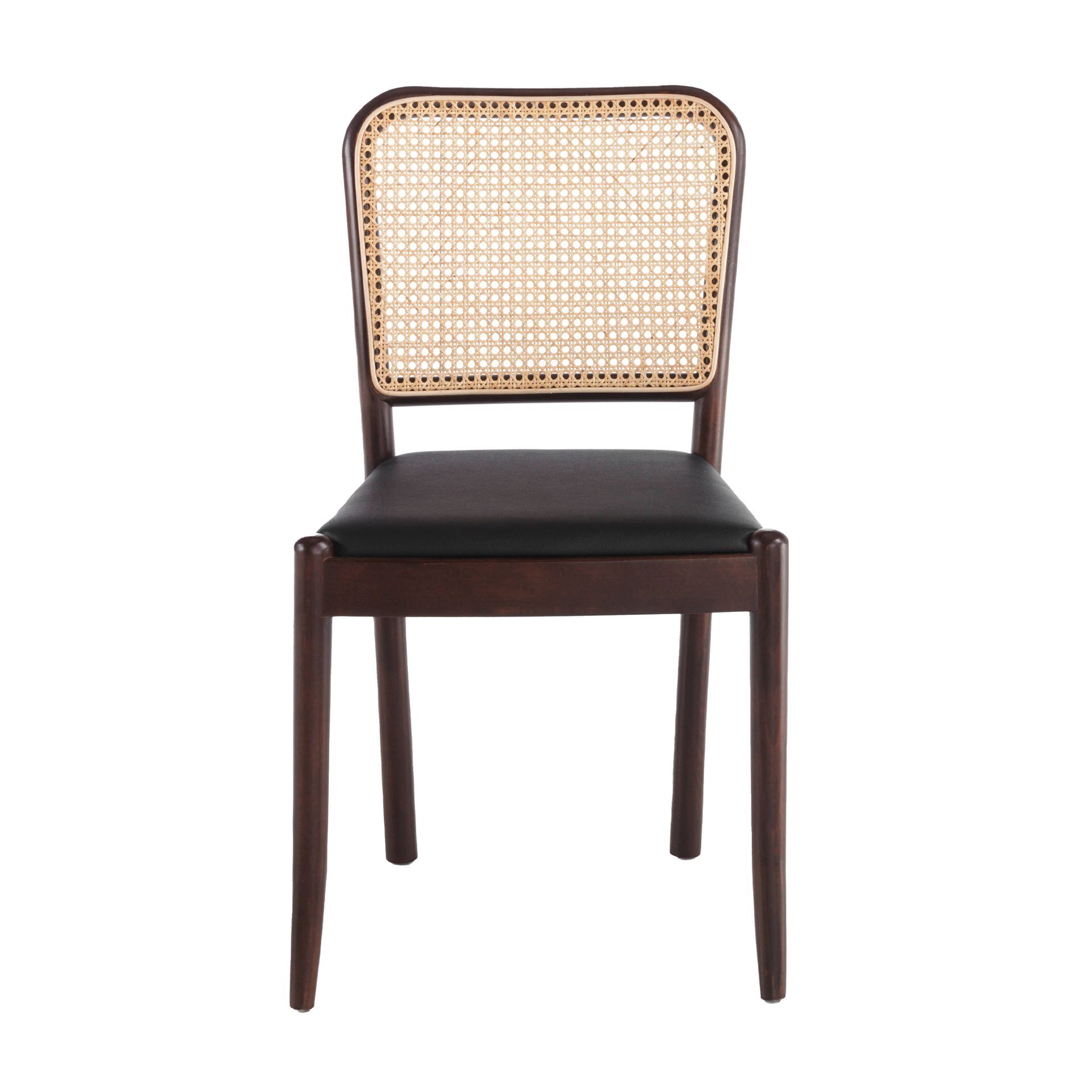 Стул из массива ясеня, окрашенный в цвет орехового дерева, с сиденьем, обитым черной кожзаменителем, и спинкой из ротанга. Сиденье заполнено вспененным полиэфиром плотностью 25 кг/м3.