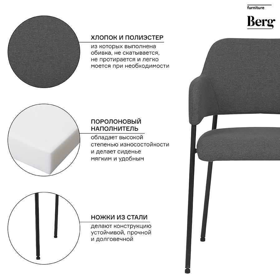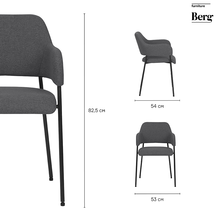 Материалы: полиэстер, фанера, сталь. Размеры: 53х52х83 см. Высота сиденья: 50 см. Ширина сиденья: 44 см. Глубина сиденья: 43 см. Высота спинки: 36 см. Ширина спинки: 38 см. Максимальная нагрузка: 120 кг. Цвет: темно-серый.