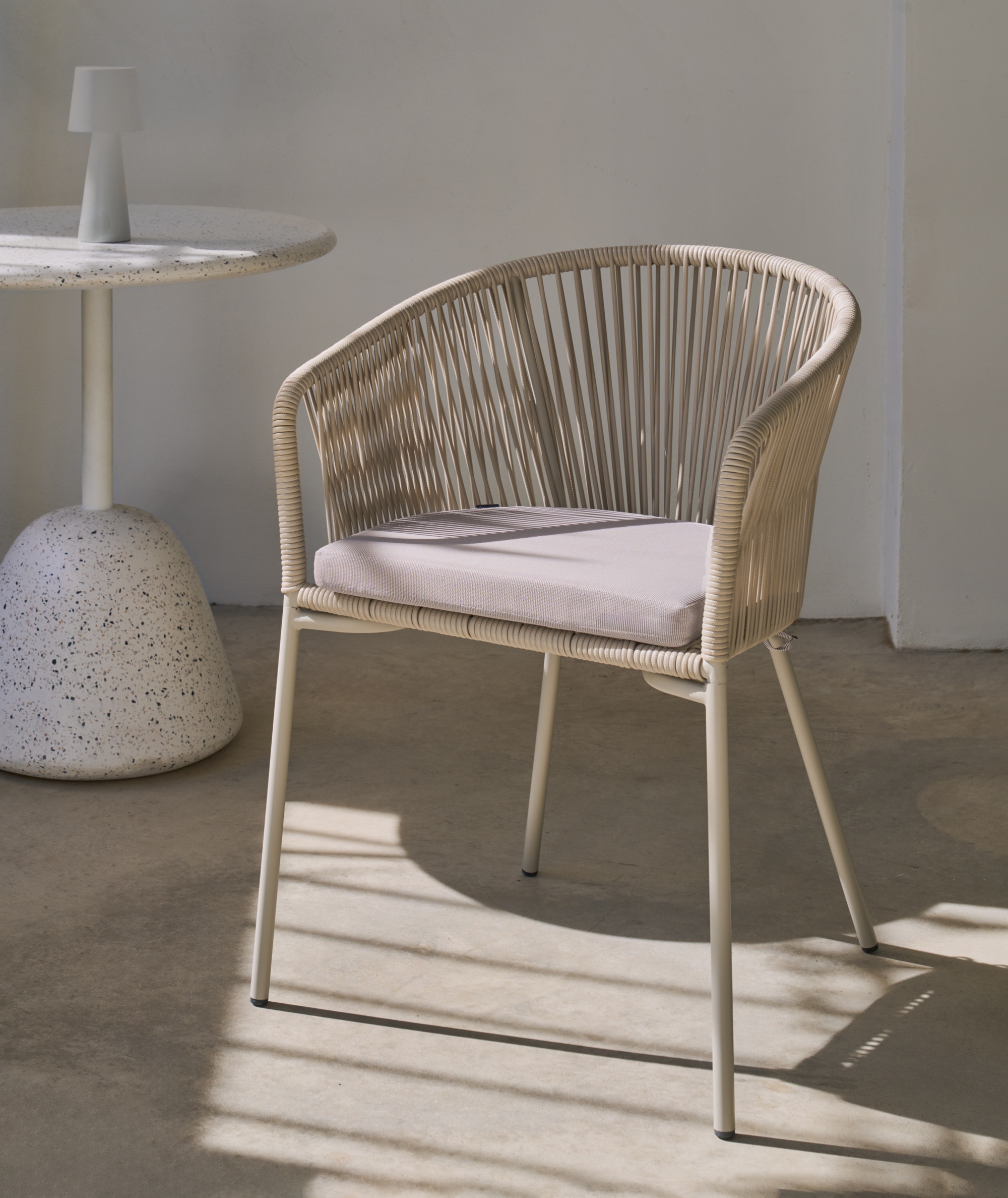 Для обеда в помещении или на свежем воздухе стул Yanet придает непринужденный вид всем типам комнат благодаря плетеному вручную синтетическому веревочному сидению и материалам, которые позволяют наслаждаться им под крытой открытой площадкой.