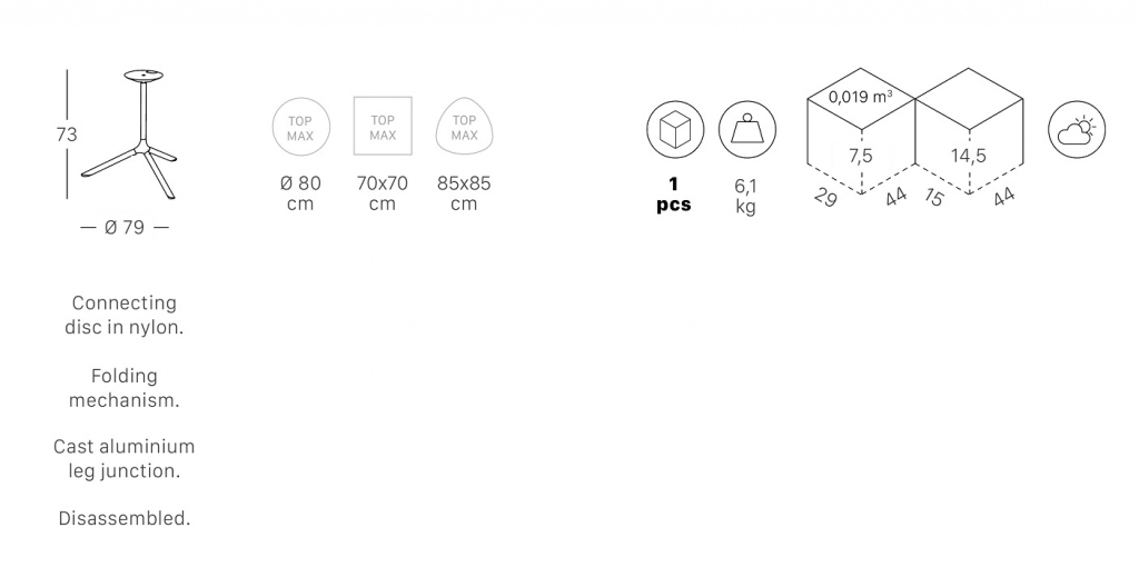 Дизайн:RadiceOrlandini DesignStudio. Награды:GOOD DESIGNAward 2021 в номинации "Самаяинновационная иэкологически устойчиваяколлекция года". Tripe- это новая коллекция необычныхподстольев с тремя лучами.Изделие, в котором функциональность, дизайн, минимализм и узнаваемость находят правильный синтез. Стальное основание с соединениямииз литого под давлением алюминия на самом деле не является традиционным моноблоком, оно состоит из нескольких элементов, которые можно заменить по мере необходимости.Tripe- это промышленный проект, внимательный к экономической составляющей, представляет собой по-настоящему гибкую и многообразную систему, дающую жизнь коллекции столов и аксессуаров различных форм и размеров, идеально подходящих для дома и общественных помещений. Особенности: Колонна с круглым сечением Ø35 мм выполненаиз стали с порошковым покрытием. Трехлучевое основаниевыполненоиз стали с порошковым покрытием. Соединение ножек выполненоиз литого алюминия. Складной механизм,выполненныйизнейлона,позволяет складывать столы в вертикальное положение и экономить место. Максимальные размеры столешницы: 850х850 мм; Ø800 мм. Данная модель предназначена для использования на летних верандах, террасах, фудкортах, а такжево внутреннем интерьере кафе, ресторанов. Резиновые ножки. Поставляется в разобранном виде. Посмотреть технические характеристики. Для уточнения всех возможных вариантов материала ицвета данного изделия обращайтесь к нашимменеджерам!