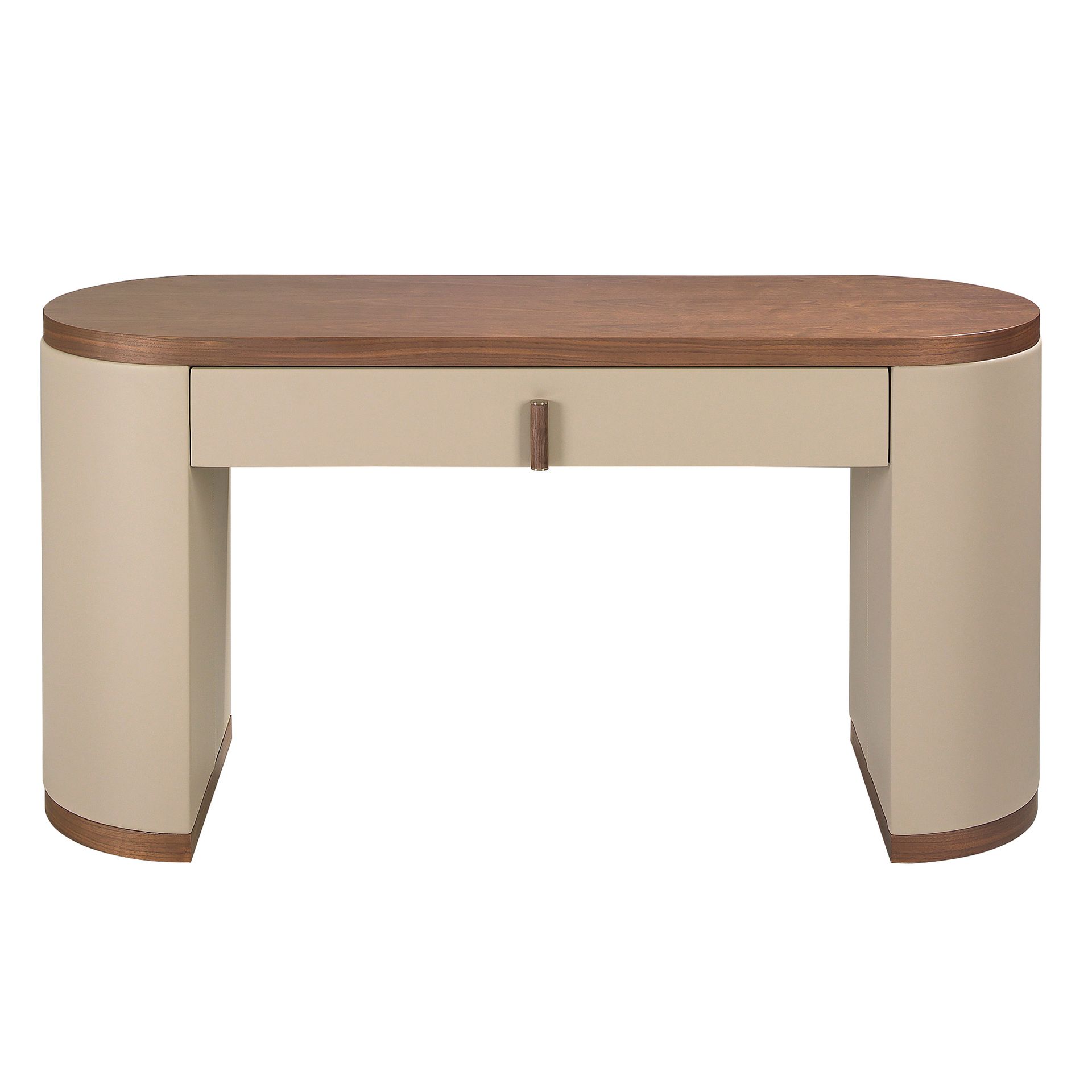 Туалетный столик современного дизайна из натурального орехового шпона в сочетании с элегантной обивкой из искусственной кожи цвета норки. Дизайн ножек, обитых искусственной кожей цвета норки, добавит изысканности и эксклюзивности вашему интерьеру. Благодаря вместительному отделению для хранения с одним ящиком, открывающимся с помощью язычка и доводчика, он позволяет хранить вещи аккуратно и на своих местах.