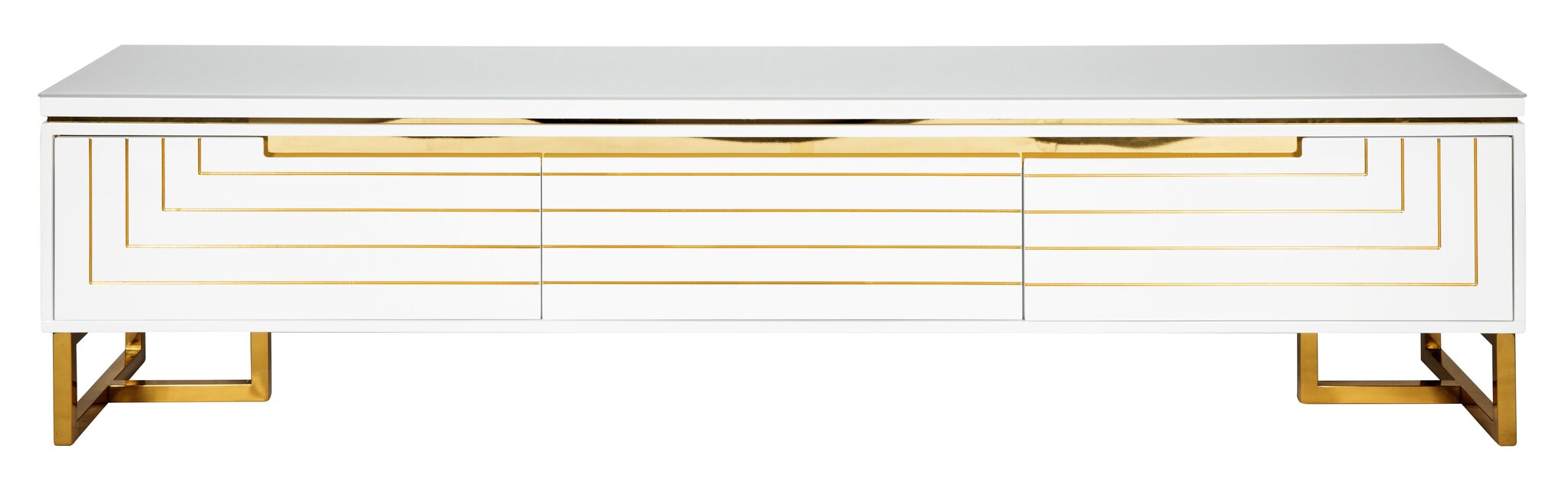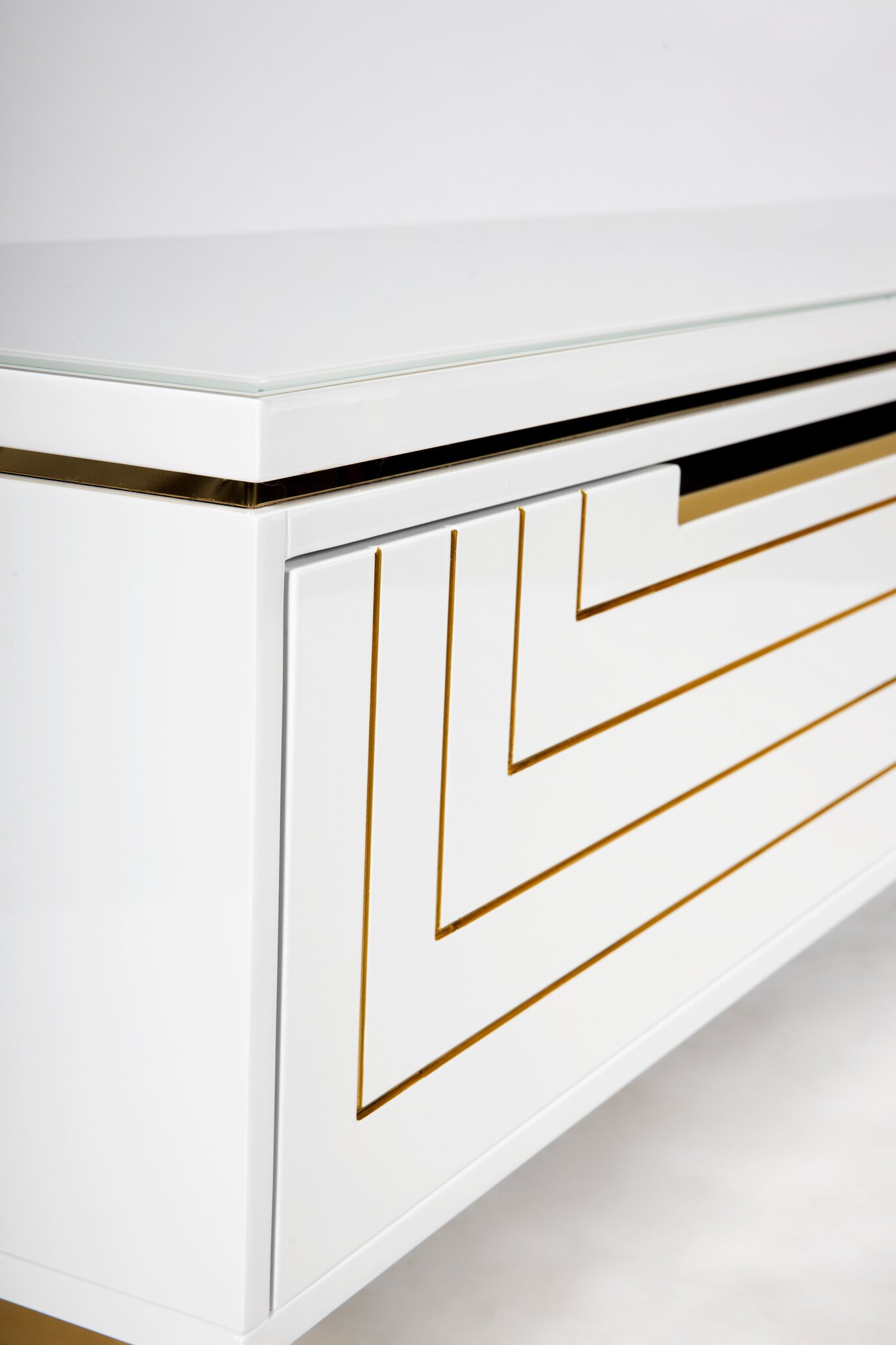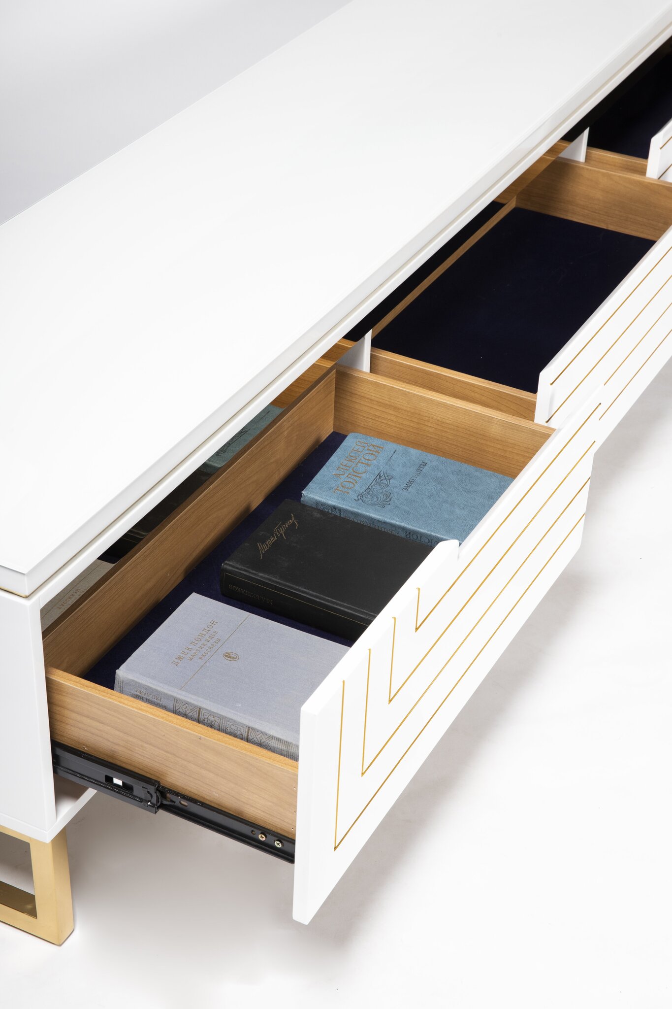 Дизайнерская тумба под телевизор в стиле арт деко из нашей новой коллекции покорит даже самого искушенного. Изысканный рисунок на фасаде. Обивка ящиков велюром. Корпус покрыт в несколько слоев глянцевым лаком. Опоры из полированной нержавеющей стали золотого цвета, скошенные углы. Данная модель прекрасно впишется в современную гостиную, столовую или спальню. Также в коллекции представлены кофейные столы, комод и консоли, чтобы наполнить ваш интерьер атмосферой элегантности и неповторимого стиля.
