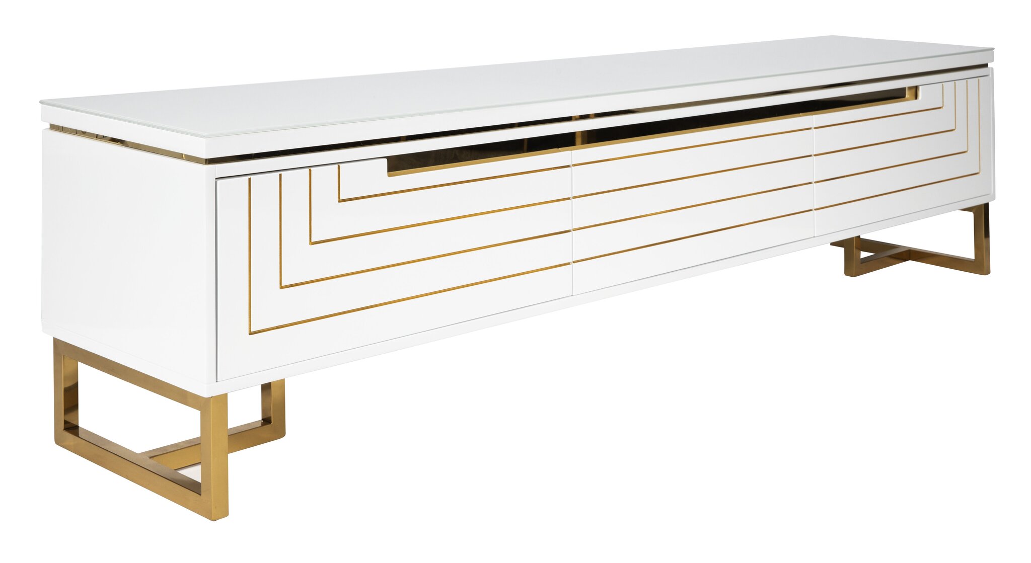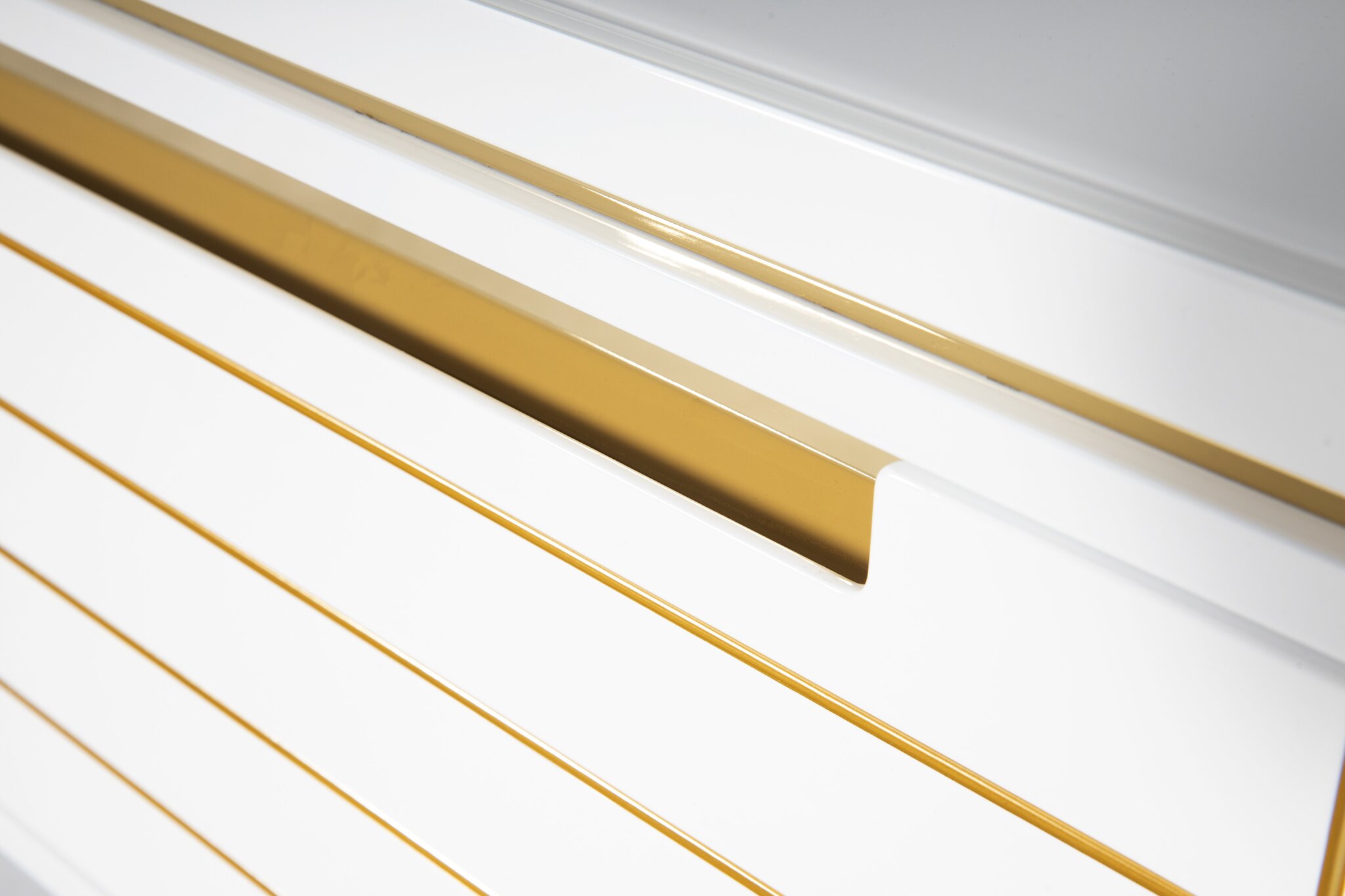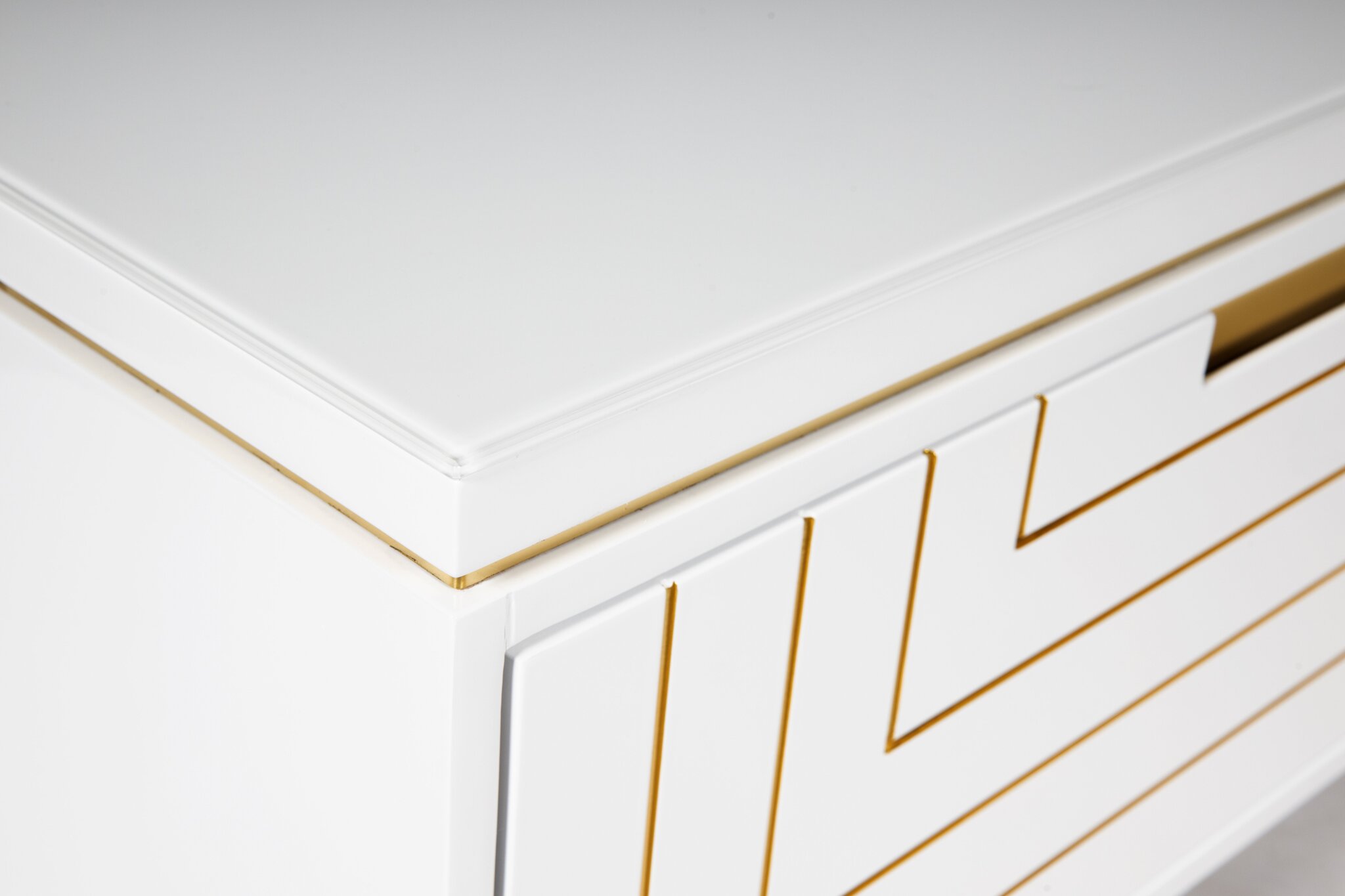 Дизайнерская тумба под телевизор в стиле арт деко из нашей новой коллекции покорит даже самого искушенного. Изысканный рисунок на фасаде. Обивка ящиков велюром. Корпус покрыт в несколько слоев глянцевым лаком. Опоры из полированной нержавеющей стали золотого цвета, скошенные углы. Данная модель прекрасно впишется в современную гостиную, столовую или спальню. Также в коллекции представлены кофейные столы, комод и консоли, чтобы наполнить ваш интерьер атмосферой элегантности и неповторимого стиля.