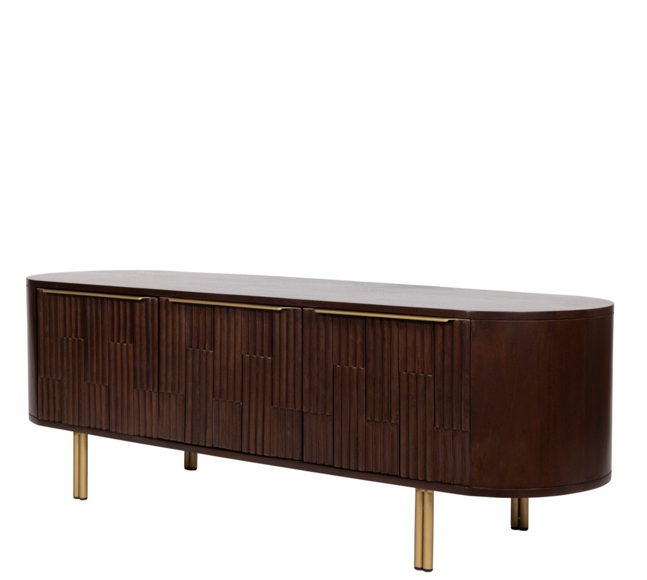 Дизайнерская тумба под ТВ Mango, выполнена в коричневых тонах, изготовлена с использованием ценной породы дерева Манго. Опоры и ручки цвета матового золота. Модель отличают элегантные округлые формы.