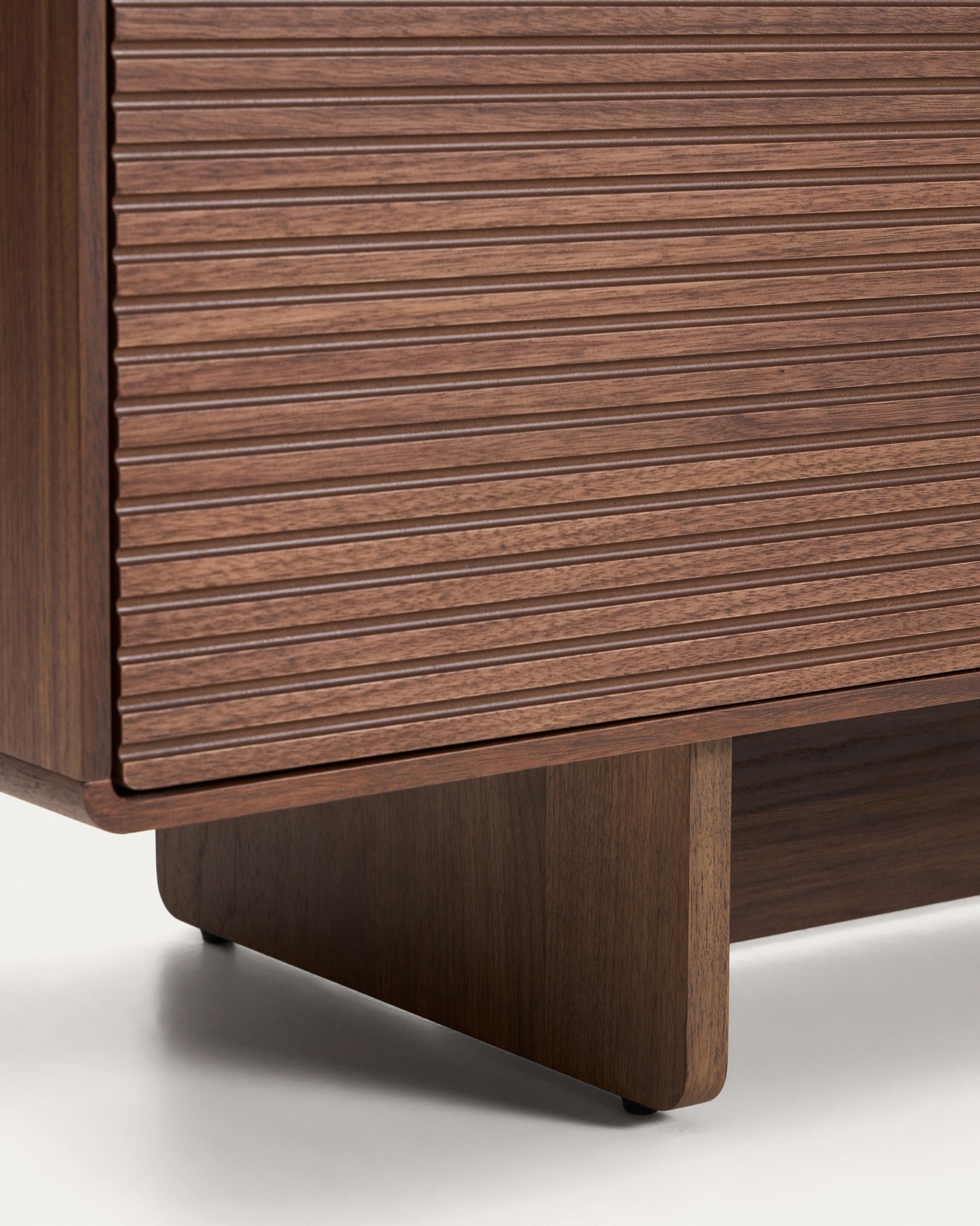 Norlen отдаёт дань уважения дизайну 1950-х годов в современной интерпретации, сочетая минималистичные формы и винтажные детали. Слегка закруглённые углы и деревянное основание создают ностальгическую атмосферу, переосмысленную благодаря чистым линиям и современным пропорциям. Тёмный ореховый шпон, нанесённый методом вакуумной мембранной печати, идеально подходит к радиусам мебели, объединяя отделку и придавая глубину и индивидуальность каждому предмету. Он покрыт полиуретановым лаком, обеспечивающим устойчивость к износу и влаге.