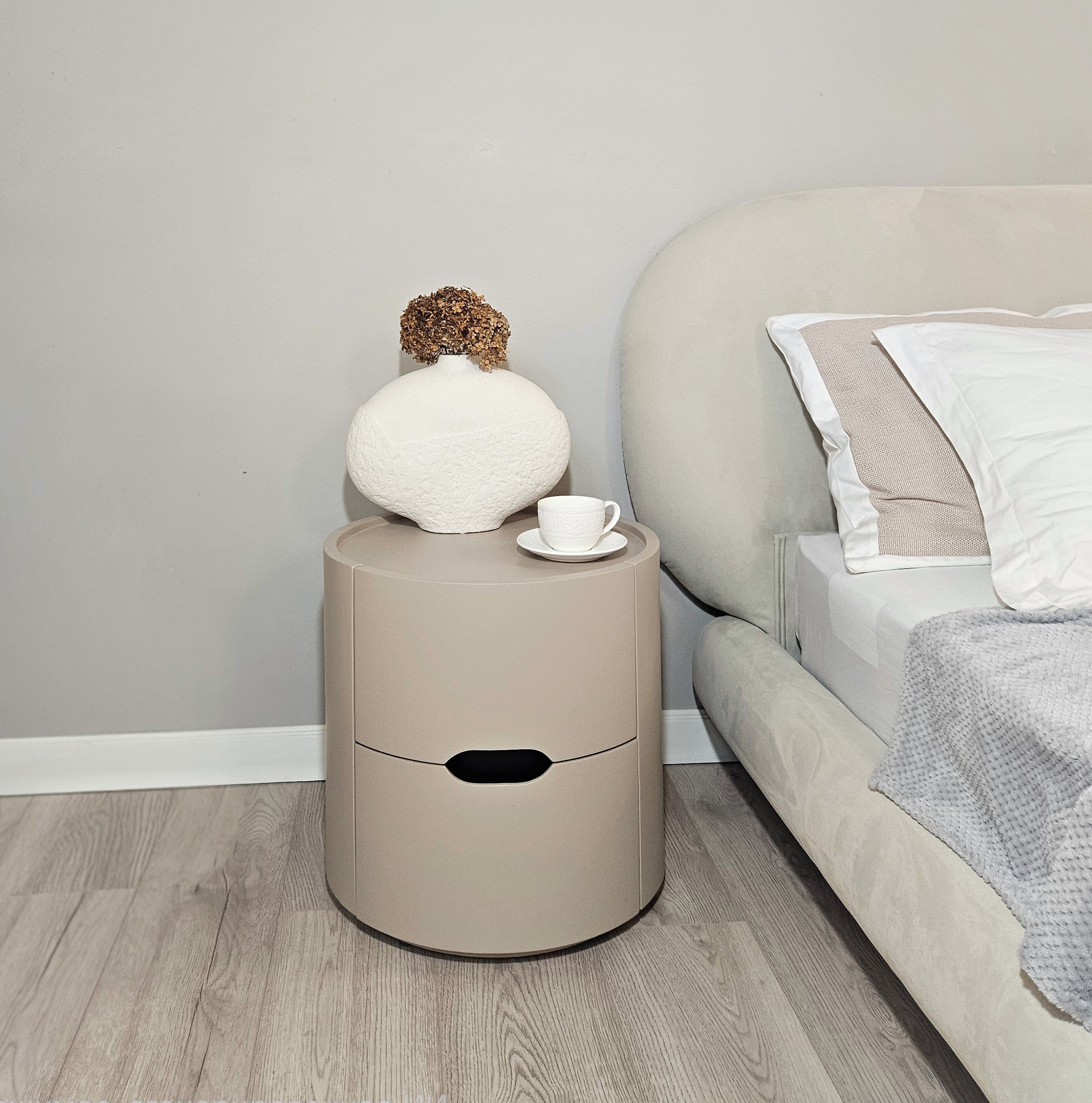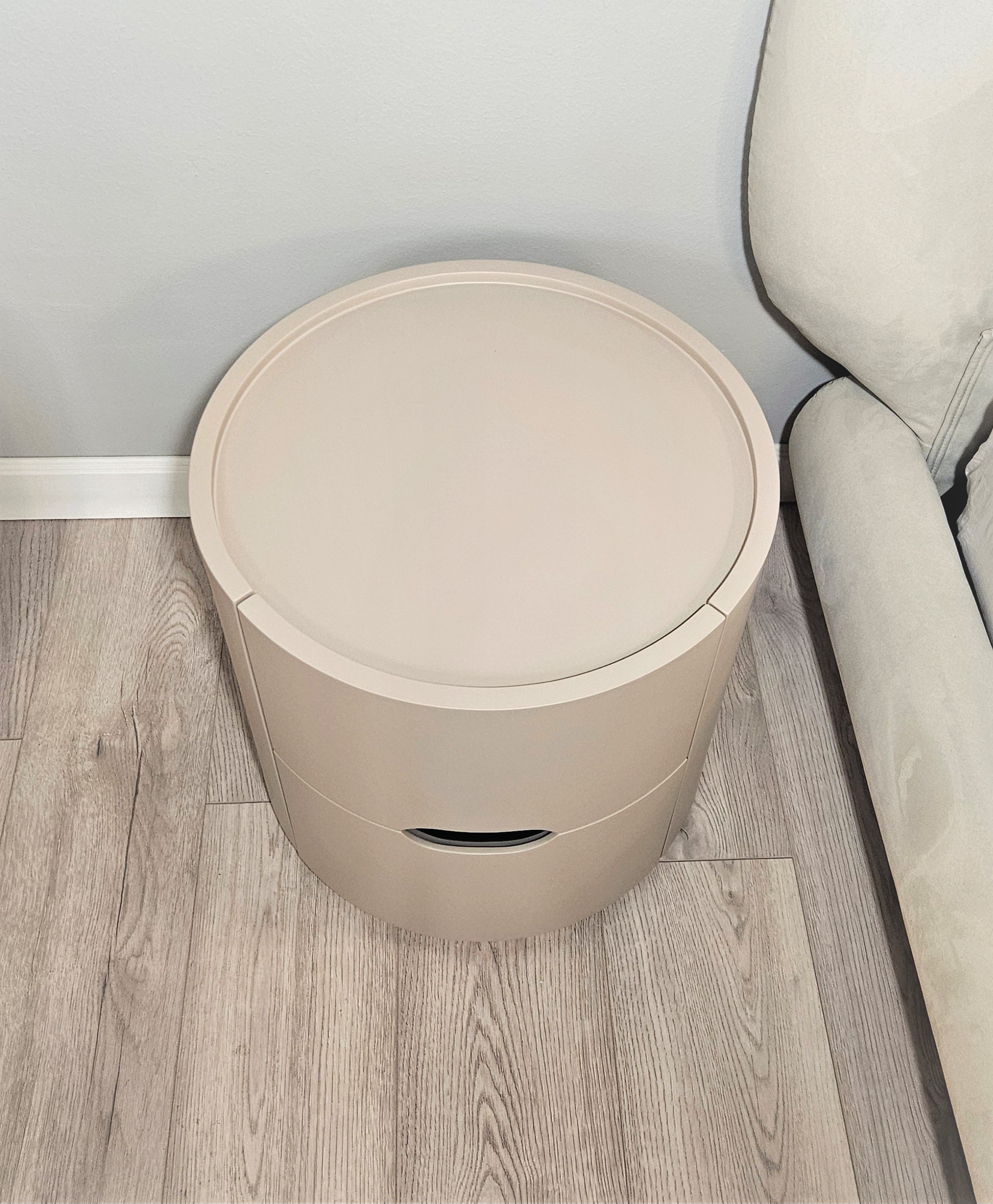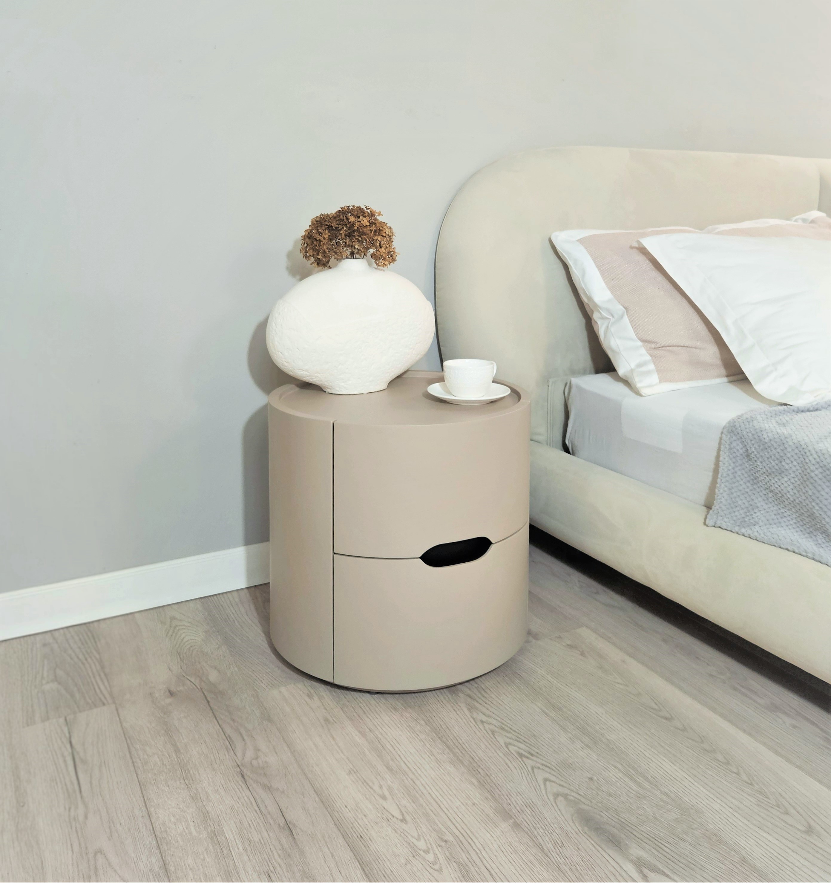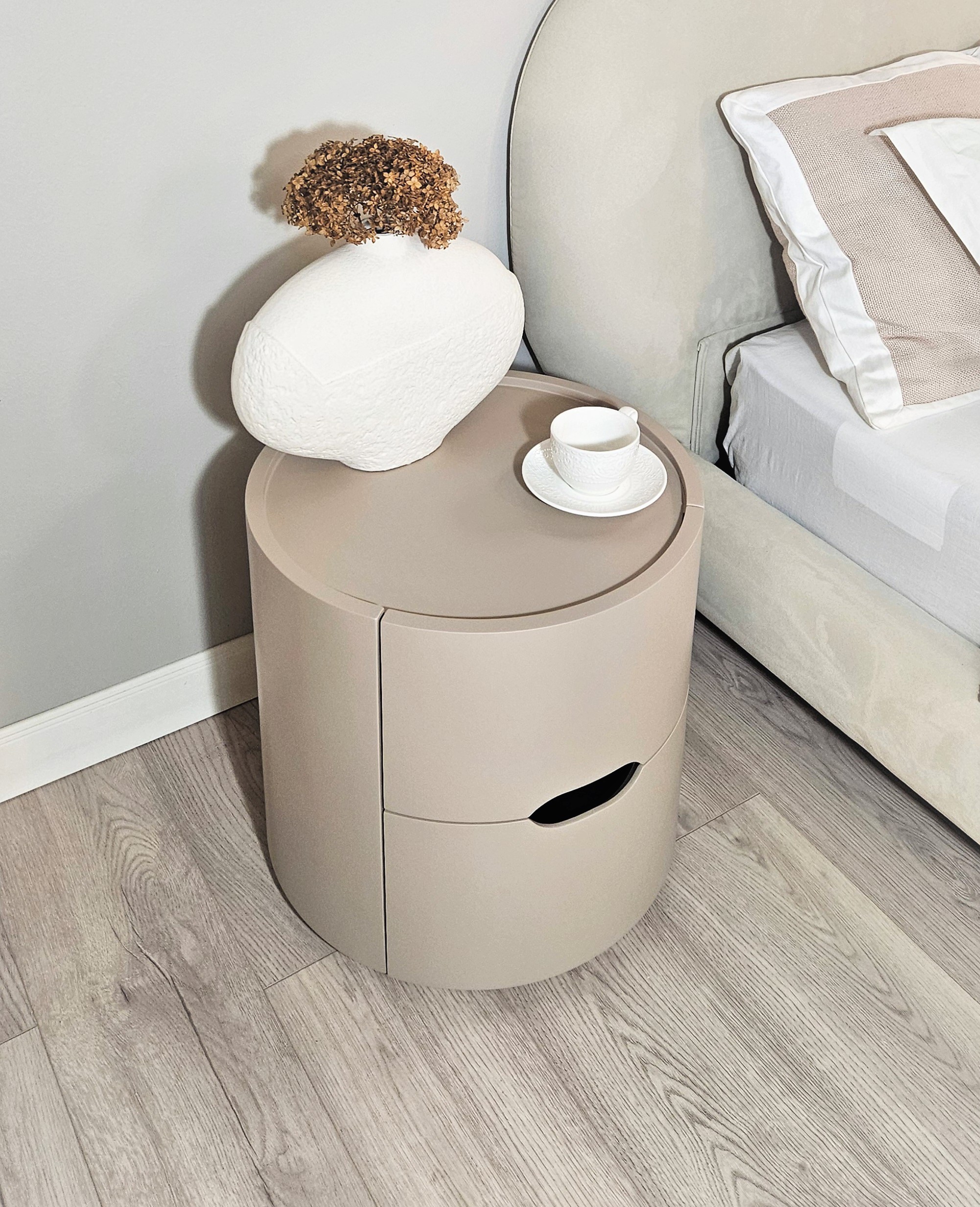 Цвет тумбы относится к нейтральной палитре между светло-коричневым и кремово-серым с теплым розовым подтоном.
