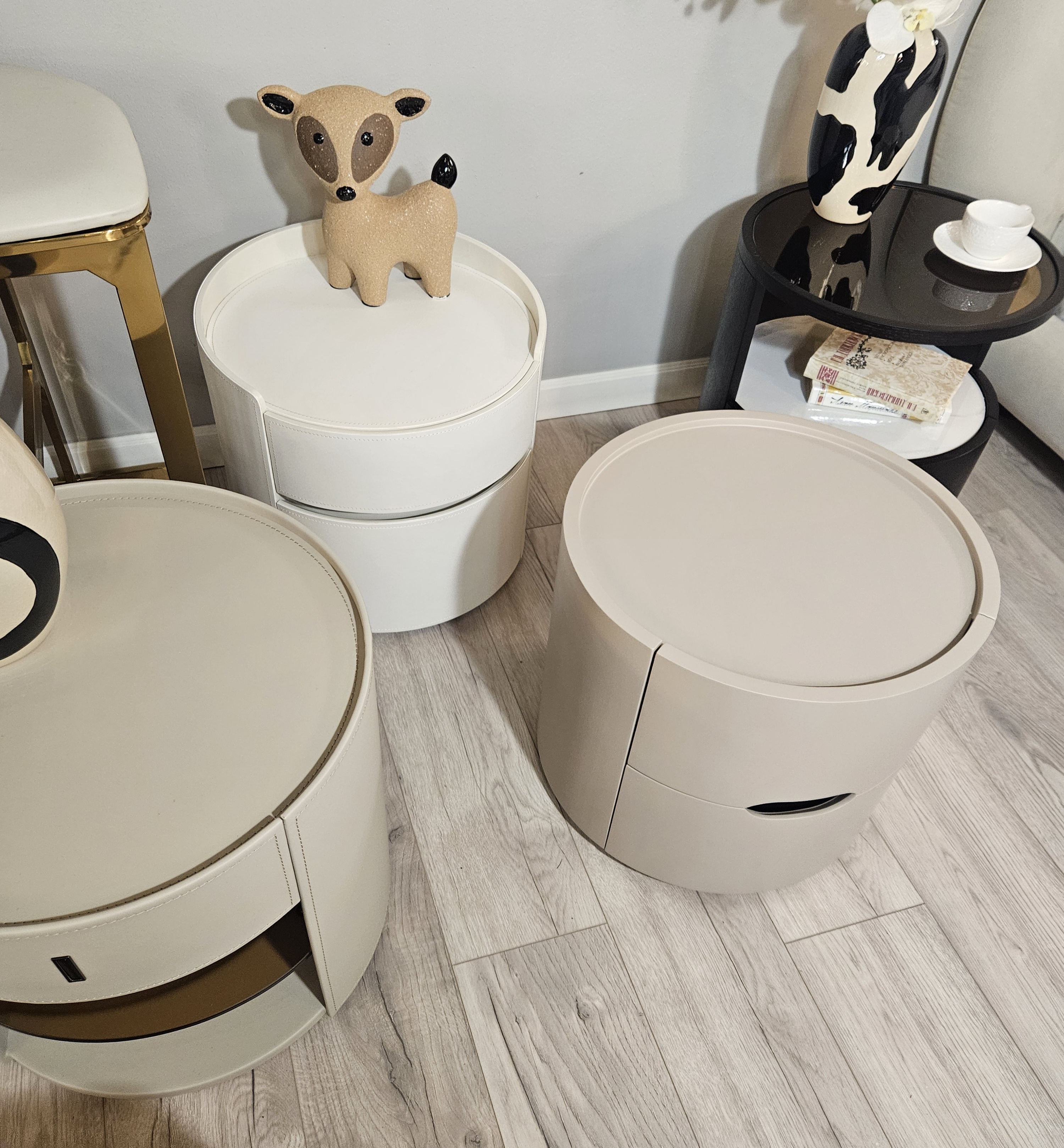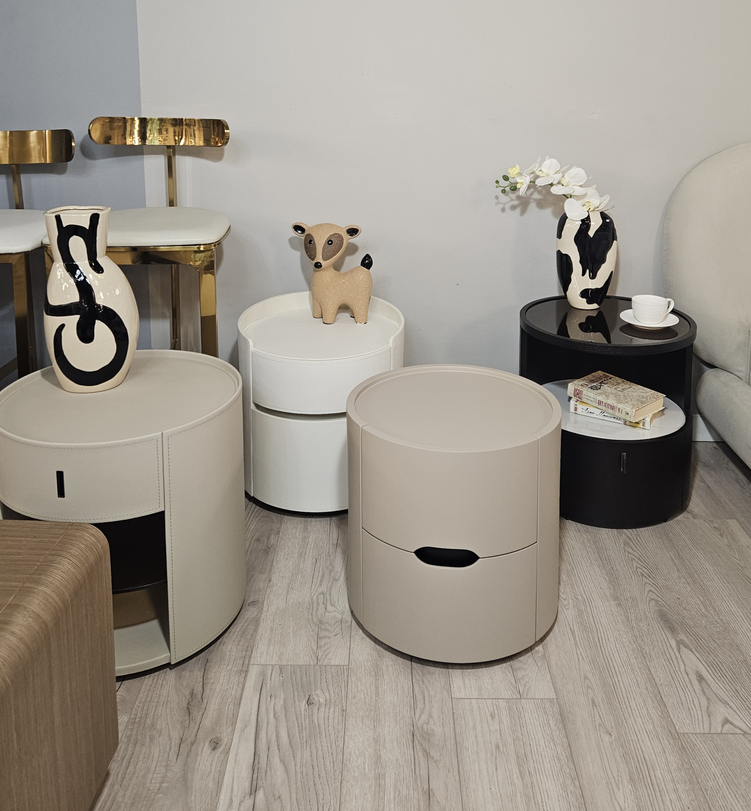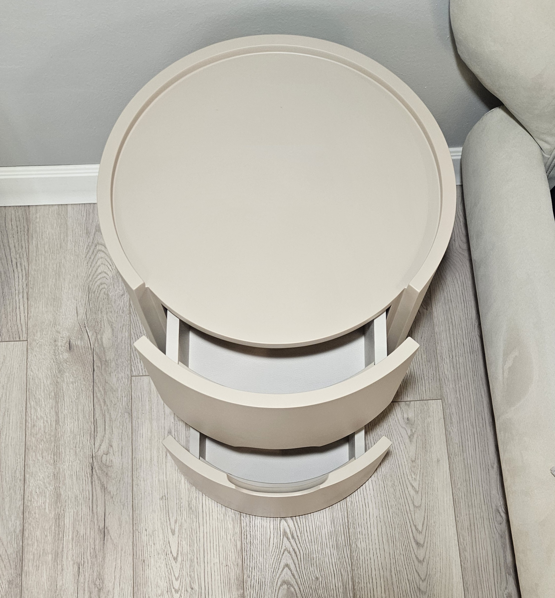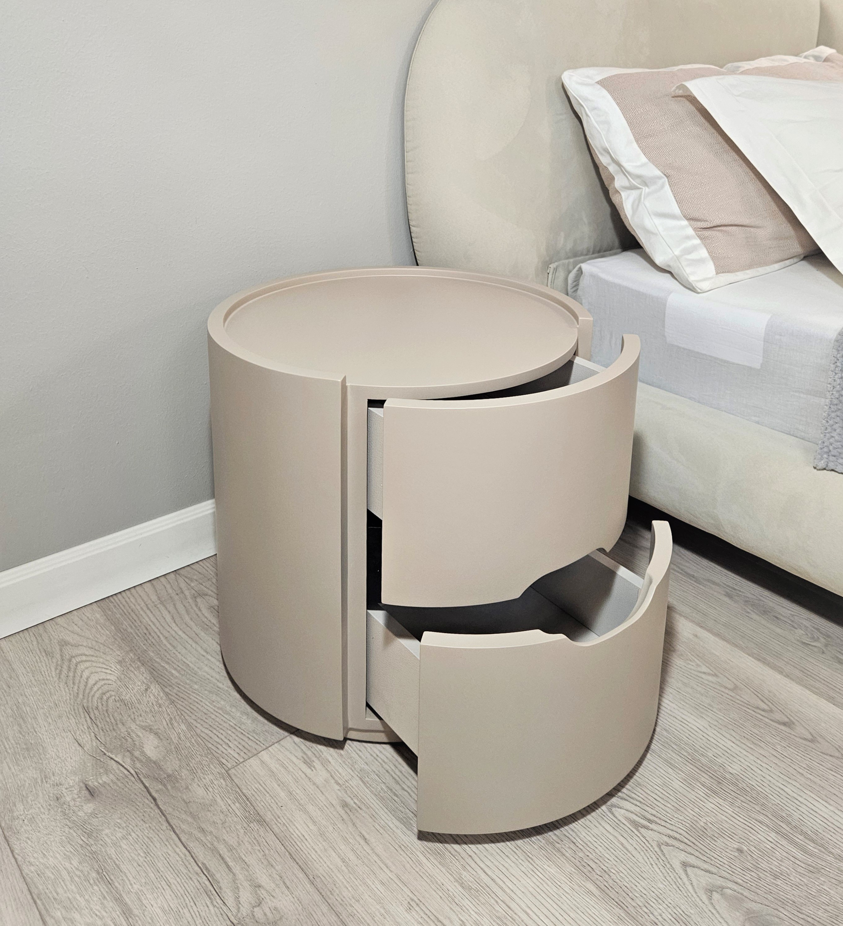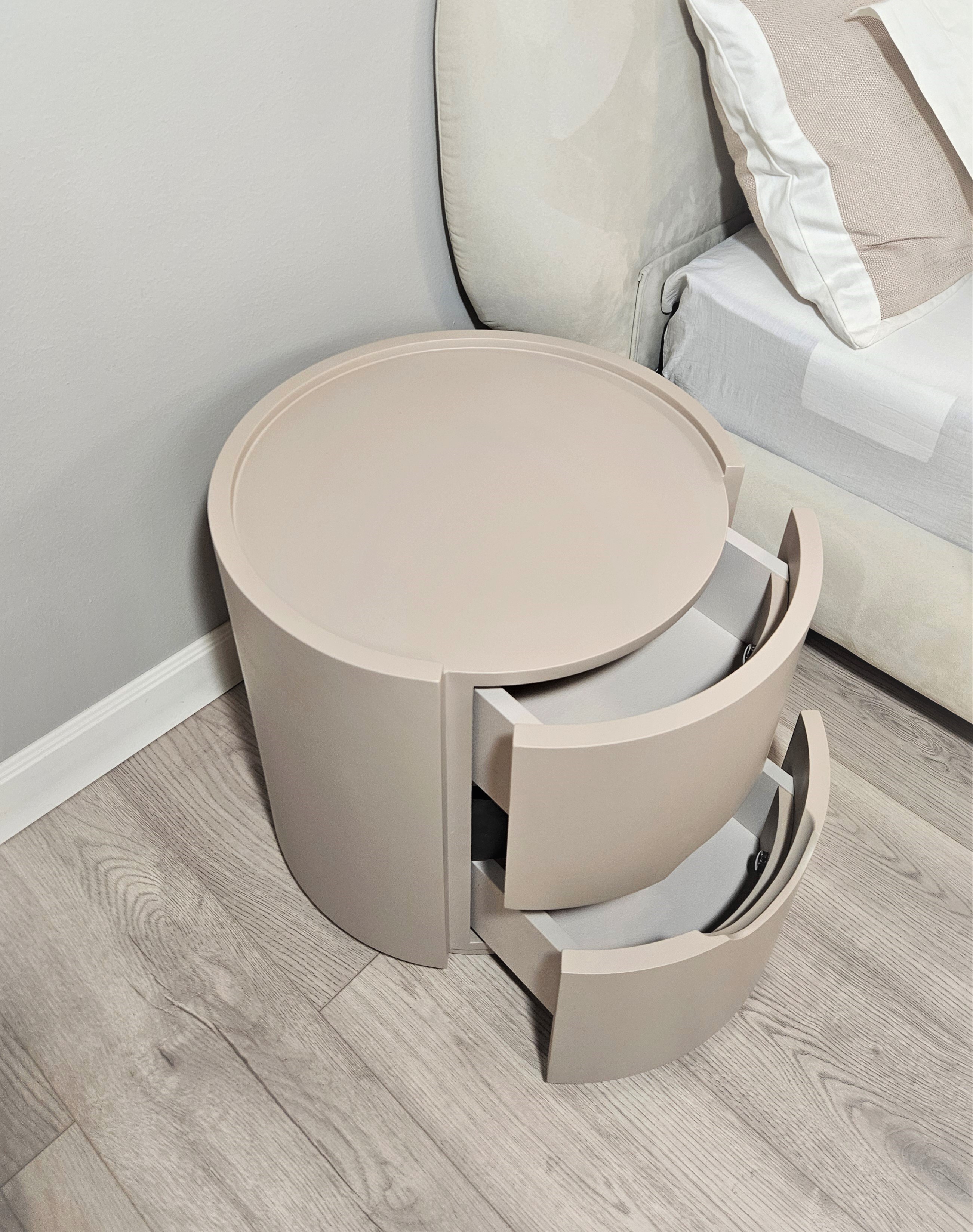Цвет тумбы относится к нейтральной палитре между светло-коричневым и кремово-серым с теплым розовым подтоном.