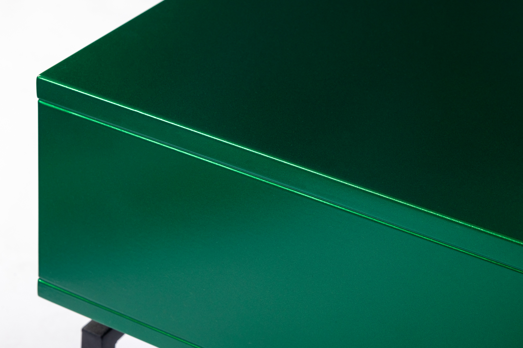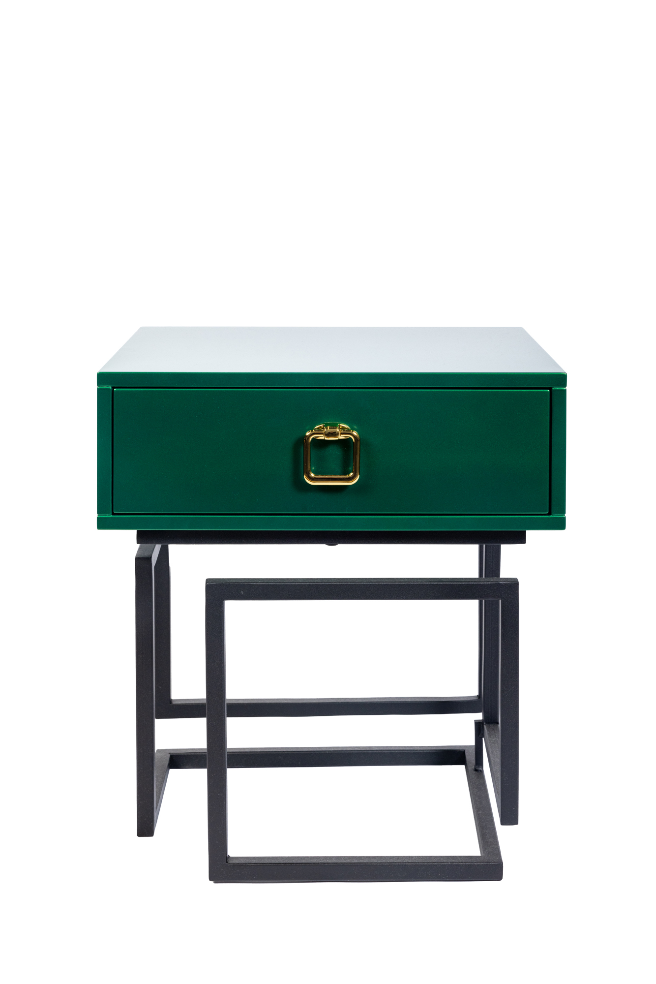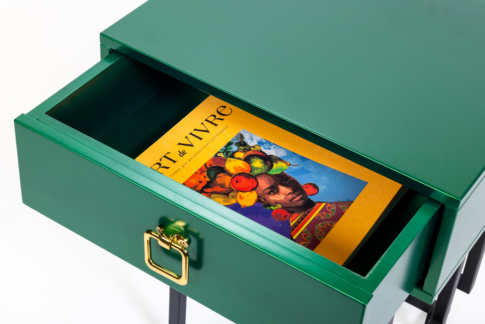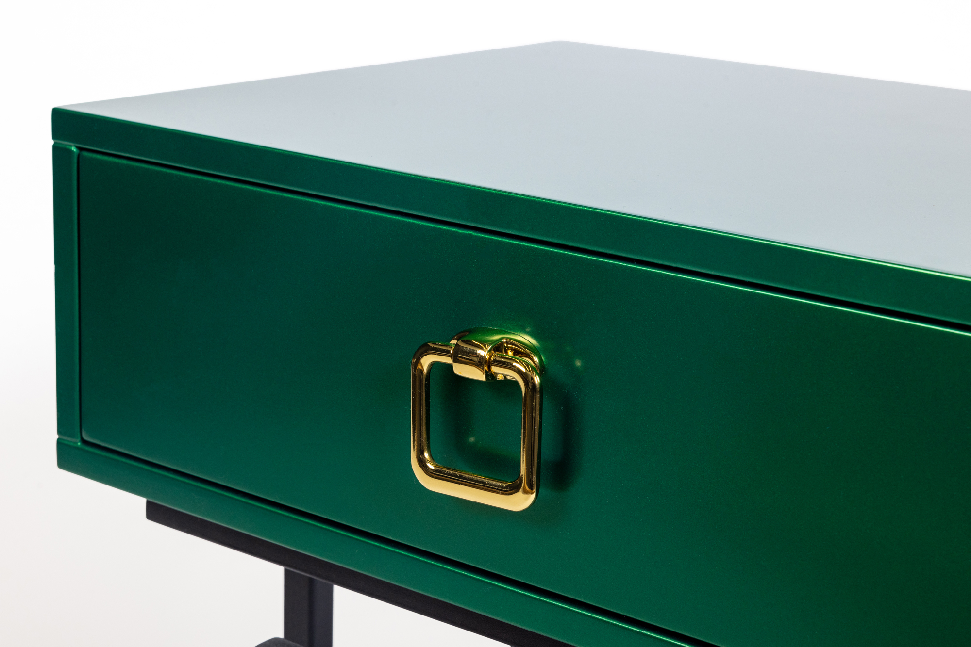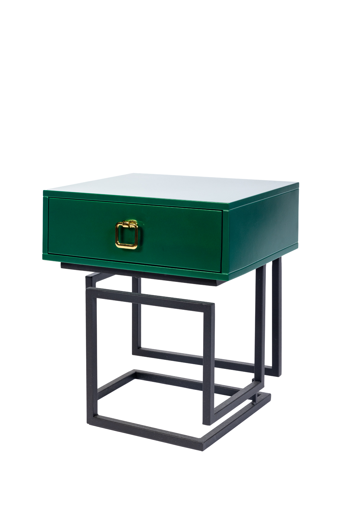 Дизайнерская прикроватная тумба из лимитированной коллекции Esthetic. Выполнена в современном стиле, вместо традиционных ножек – металлическая рама необычной формы. Ящик зеленого цвета оснащен доводчиком и украшен золотой ручкой, придающей изделию дополнительный шарм. Визуально легкая, эффектная, устойчивая и практичная, модель станет настоящим украшением вашей спальни. Данную тумбочку мы можем выкрасить по вашему RAL. Также в этой коллекции представлена консоль в аналогичном стиле.