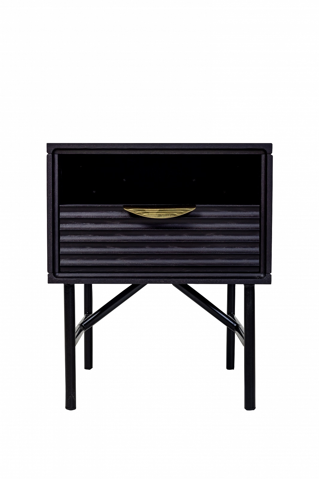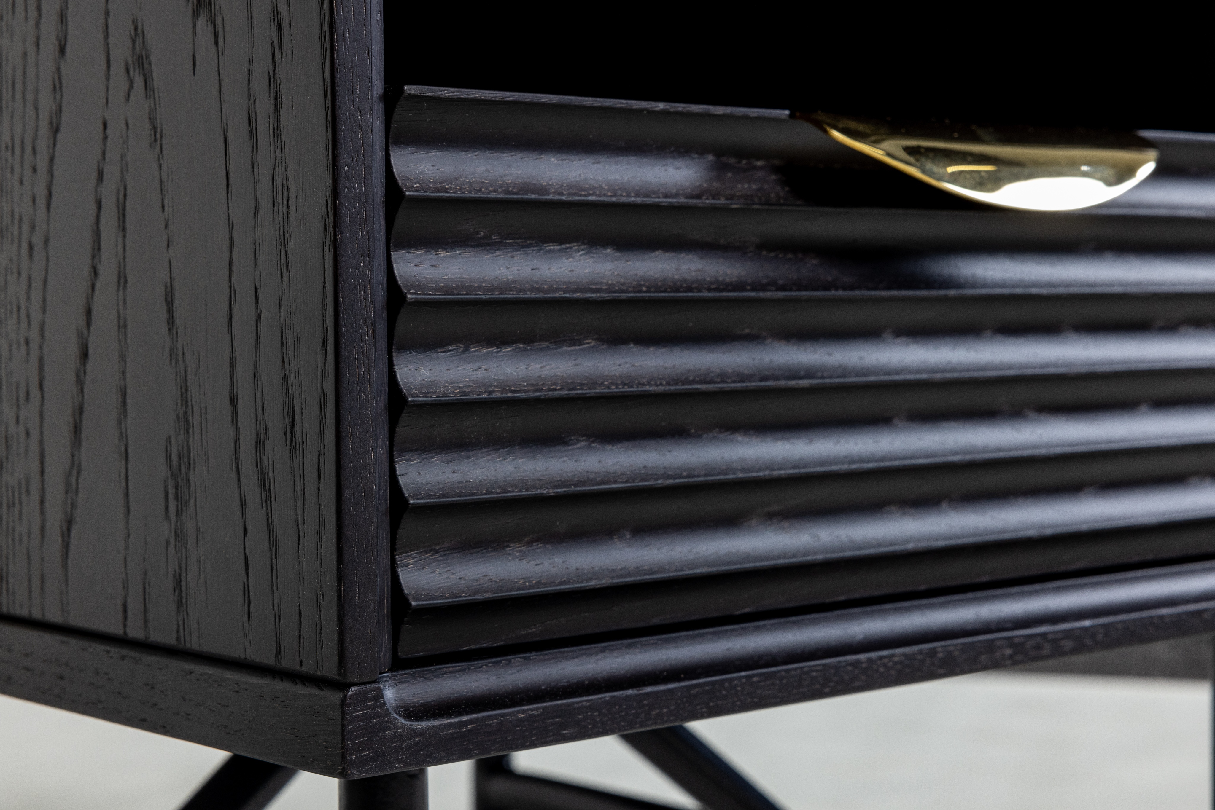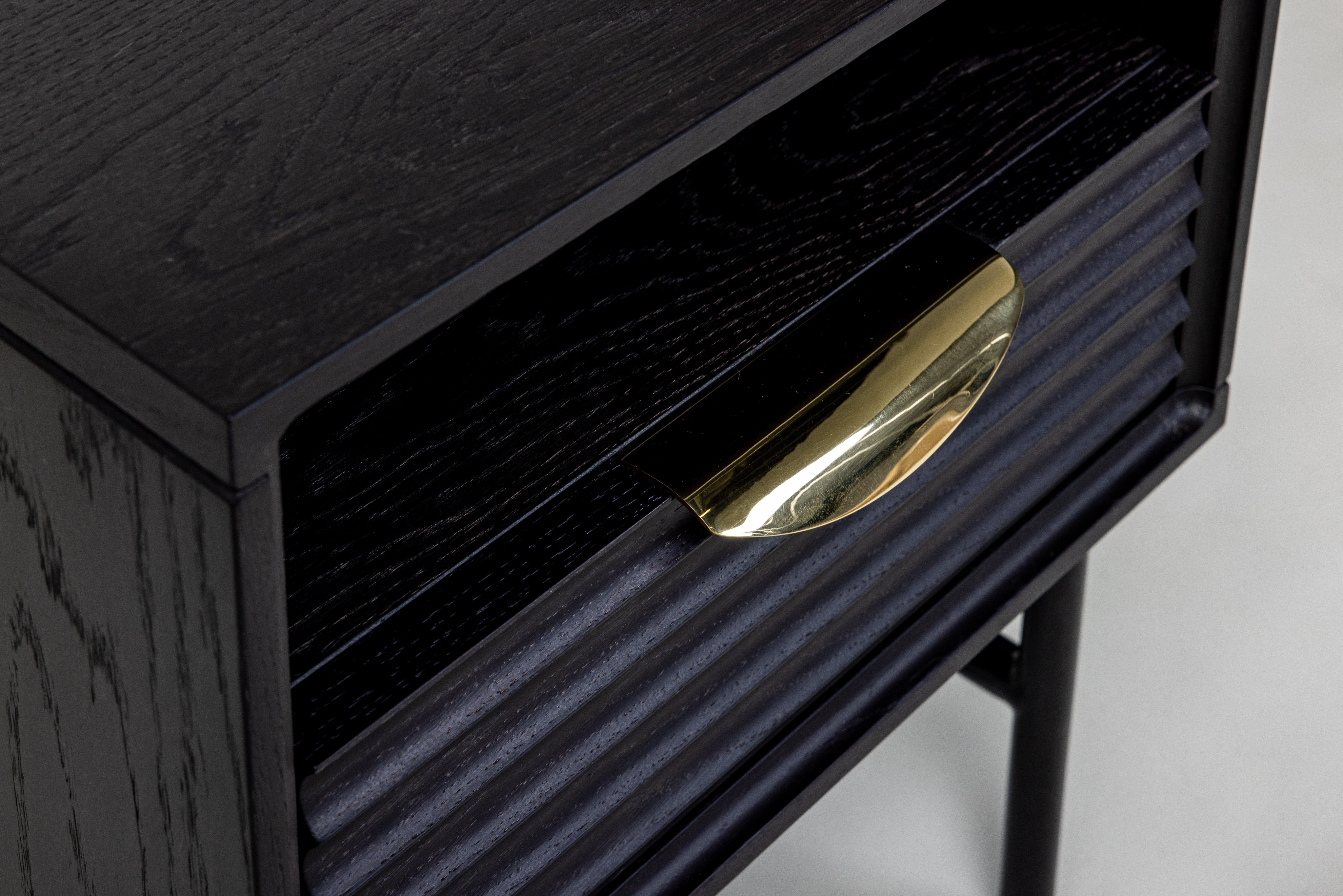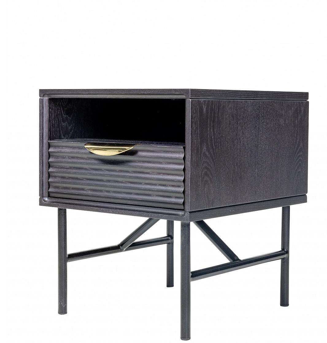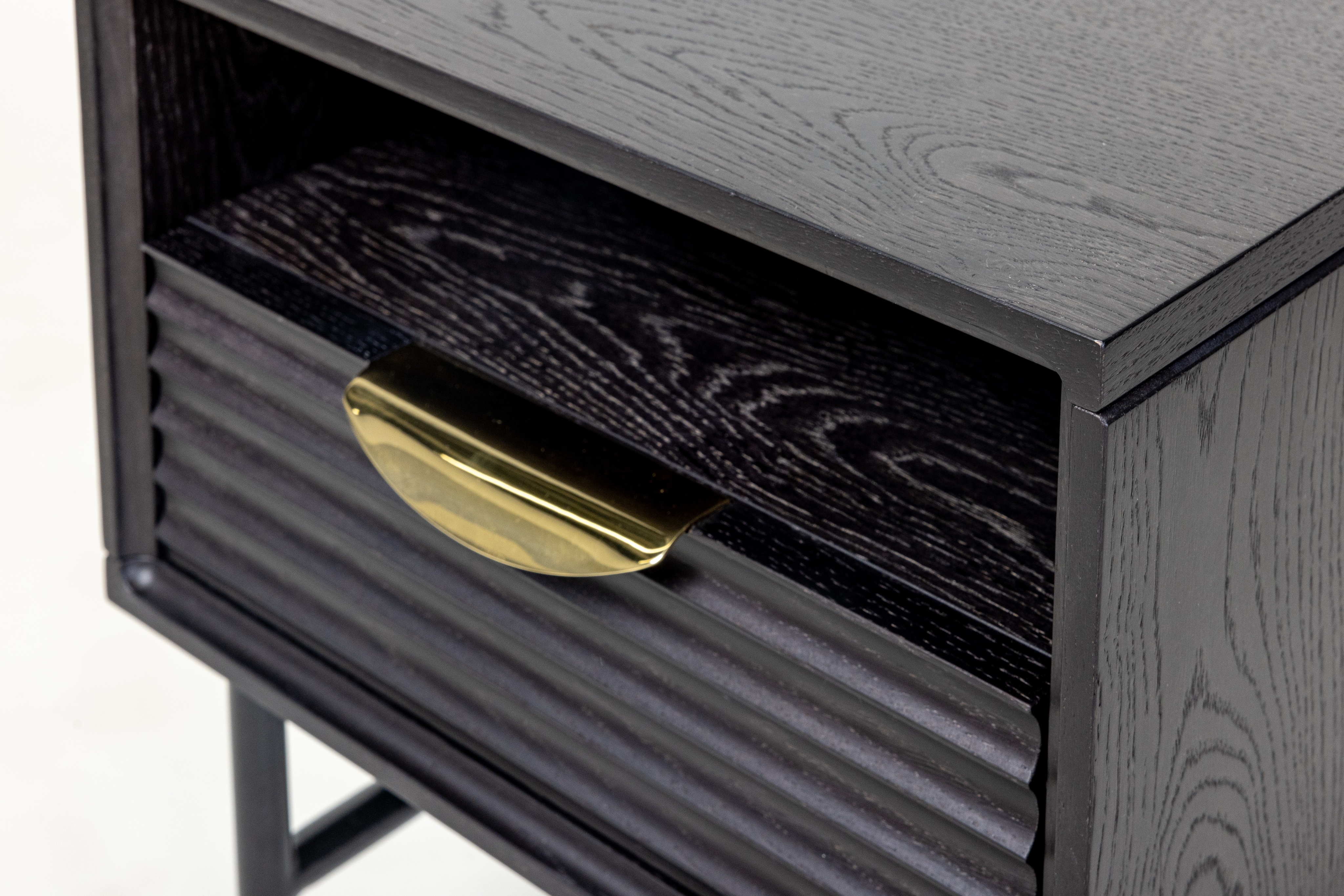 Элегантная дизайнерская тумбочка в стиле арт-деко из коллекции HAINES premium покоряет изысканным дизайном и роскошью отделки. Тщательно подобранный высококачественный шпон дуба черного цвета с текстурой дерева, прочное металлическое основание в цвет корпуса и шлифованная ручка из натуральной латуни золотого оттенка.В тумбочке имеется функциональный выдвижной ящик с доводчиком. Все элементы тщательно обработаны. На нашем сайте представлена полная коллекция HAINES premium - журнальные столы, комод, консоль, письменный стол, тв. тумбы и шкаф , чтобы ваш интерьер выглядел элегантно, модно и изысканно.