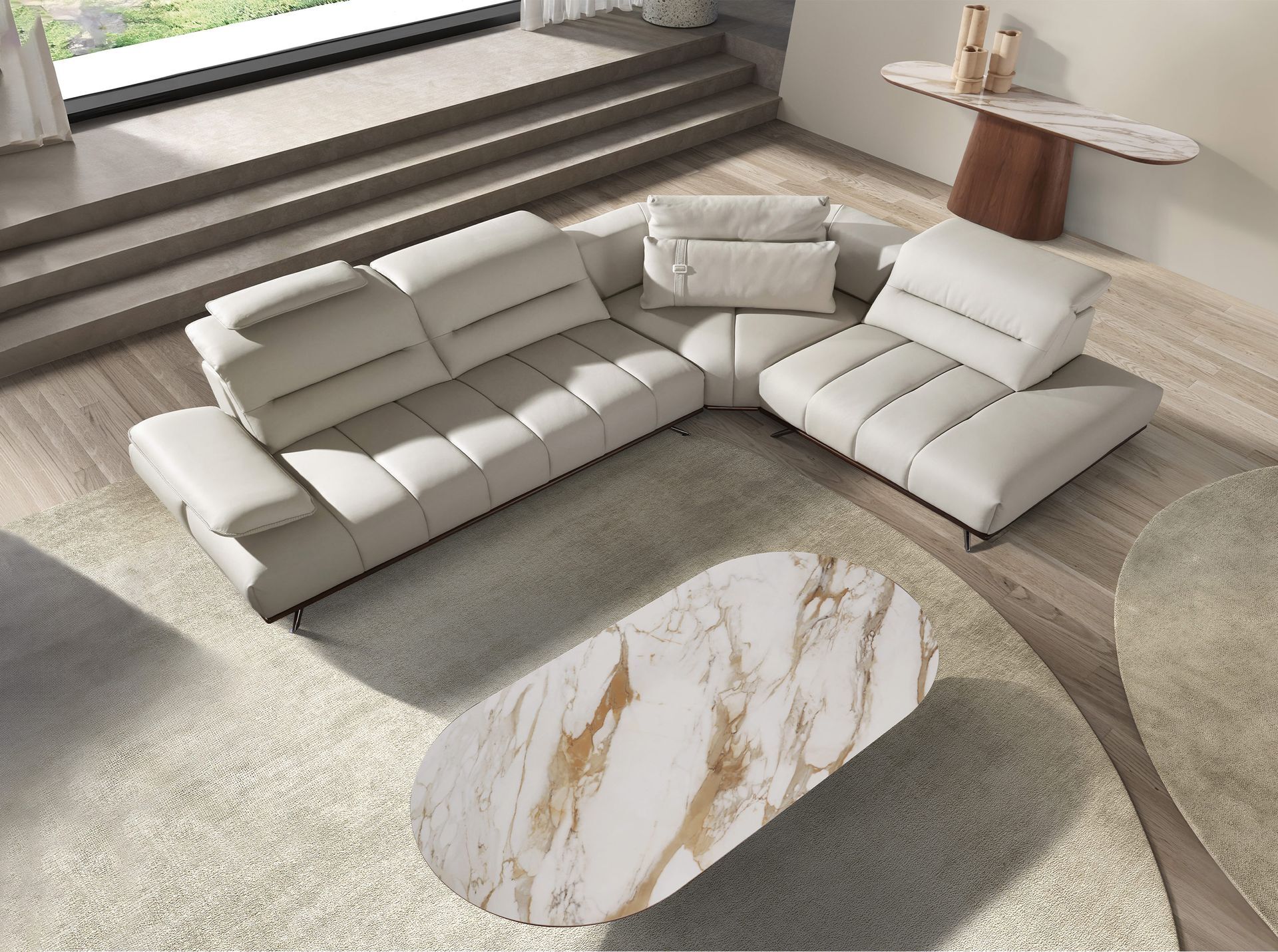 Пятиместный диван-шезлонг правого расположения с современным дизайном, обитый светло-серой воловьей кожей, с подголовником для дополнительного комфорта. Благодаря своему стилю, отделке из темного ореха и ножкам из темной хромированной нержавеющей стали этот диван привнесет в ваш дом нотку авангарда и элегантности, которую вы ищете.