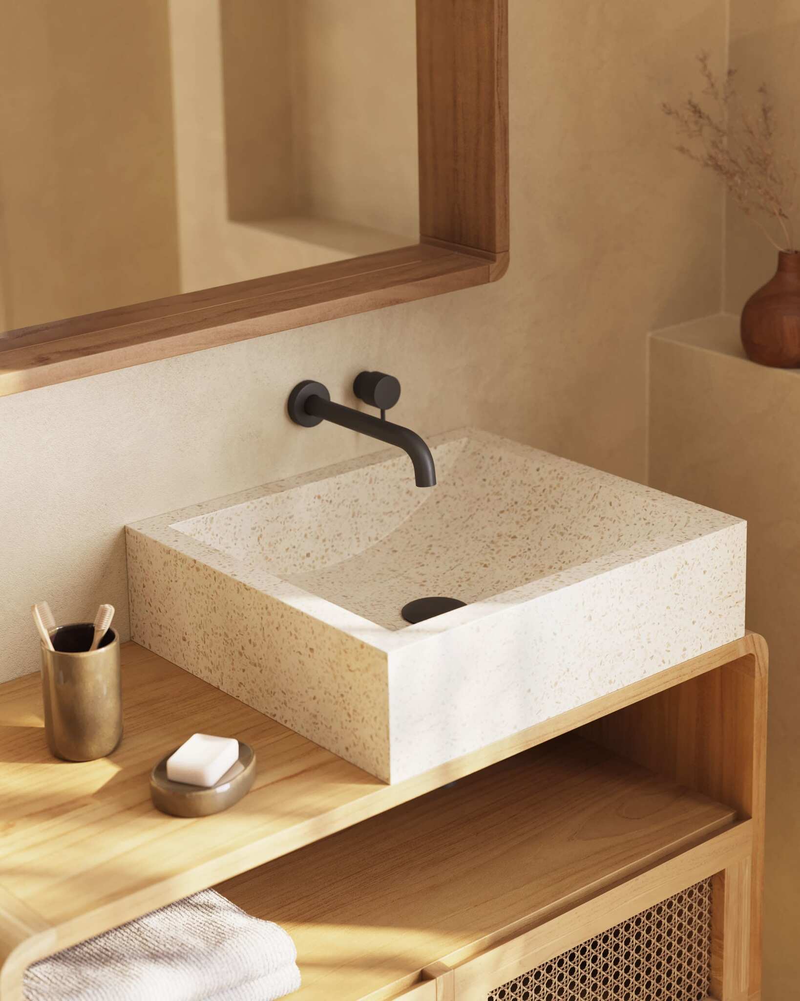 Дополните шкаф для ванной комнаты раковинами Kuveni, изготовленными из прочного терраццо, и расслабьтесь в дизайнерском спа-салоне в азиатском стиле, не выходя из дома.