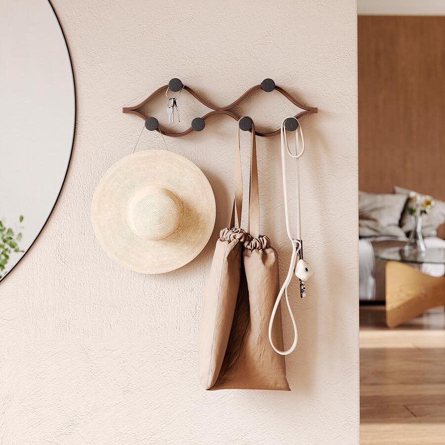 Вешалка настенная Montage идеально подойдет для компактного хранения вещей в любой из комнат и станет стильным акцентом интерьера. Сочетание дерева и элементов из металла придает аксессуару современный, но в то же время естественный вид. Вешалка оснащена шестью крючками, на которых можно удобно размещать предметы одежды, головные уборы, шарфы, сумки и другие аксессуары. Изготовленный из возобновляемых источников древесины, аксессуар одновременно стильный и экологически чистый. Материалы: сталь, береза, ясень, полипропилен. Размеры: 51х6х15 см. Максимальная нагрузка: 13,6 кг. Цвет: черный/орех. Пыль и загрязнения с поверхностей можно удалять при помощи мягкого влажного материала. Запрещается использование абразивов и агрессивной бытовой химии.