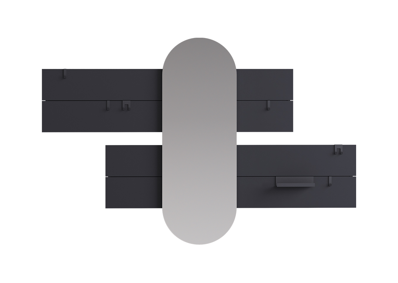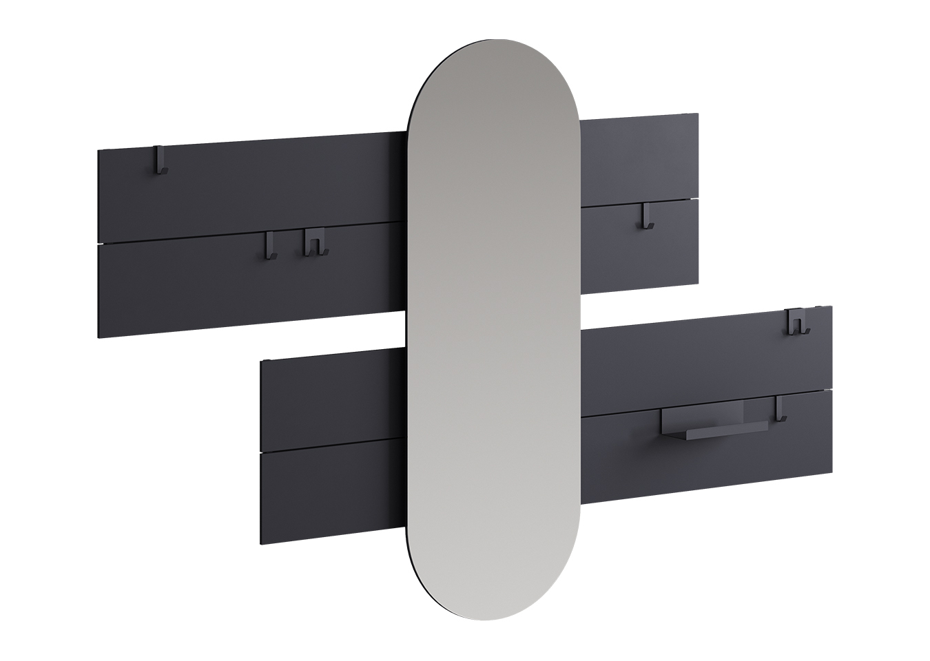 Вешалка Stripe L горизонтальная с зеркалом 60*160 см Комплект: - панель 200*50,5 см 2 шт - зеркало 60*160 см - крючок одинарный 4 шт - крючок двойной 2 шт - полка прямая 1 шт Покрытие панели эмаль RAL 9005 Покрытие крючков и полок порошковая краска цвет черный