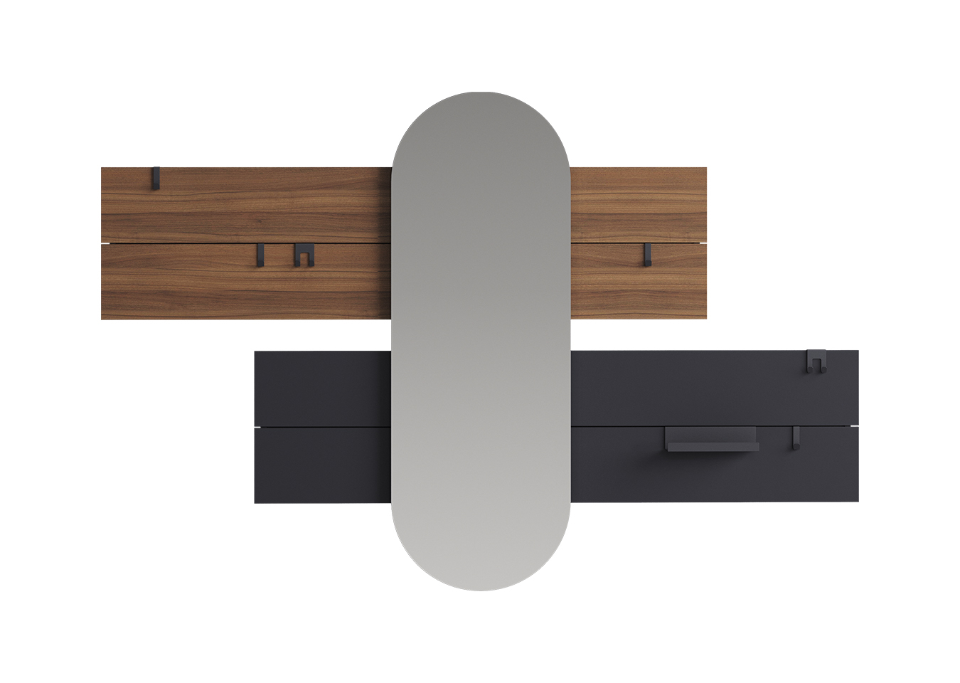 Вешалка Stripe L горизонтальная с зеркалом 60*160 см Комплект: - панель 200*50,5 см 2 шт - зеркало 60*160 см - крючок одинарный 4 шт - крючок двойной 2 шт - полка прямая 1 шт Покрытие панели шпон дуба, черный RAL 9005 Покрытие крючков и полок порошковая краска цвет черный