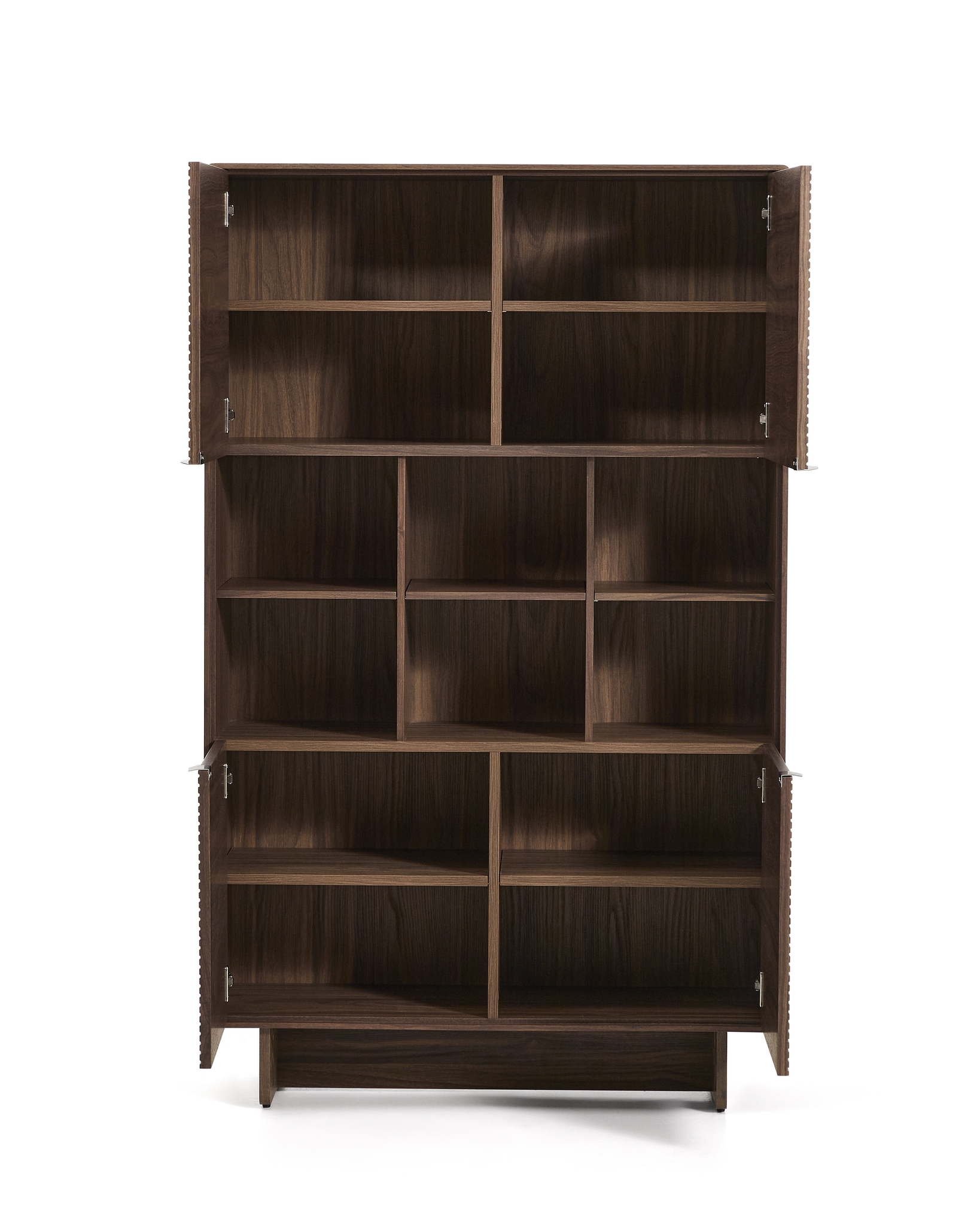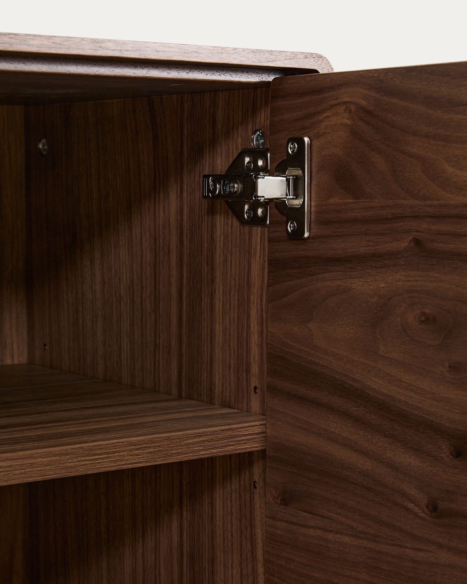 Norlen отдаёт дань уважения дизайну 1950-х годов в современной интерпретации, сочетая минималистичные формы и винтажные детали. Слегка закруглённые углы и деревянное основание создают ностальгическую атмосферу, переосмысленную благодаря чистым линиям и современным пропорциям. Тёмный ореховый шпон, нанесённый методом вакуумной мембранной печати, идеально подходит к радиусам мебели, объединяя отделку и придавая глубину и индивидуальность каждому предмету. Он покрыт полиуретановым лаком, обеспечивающим устойчивость к износу и влаге.