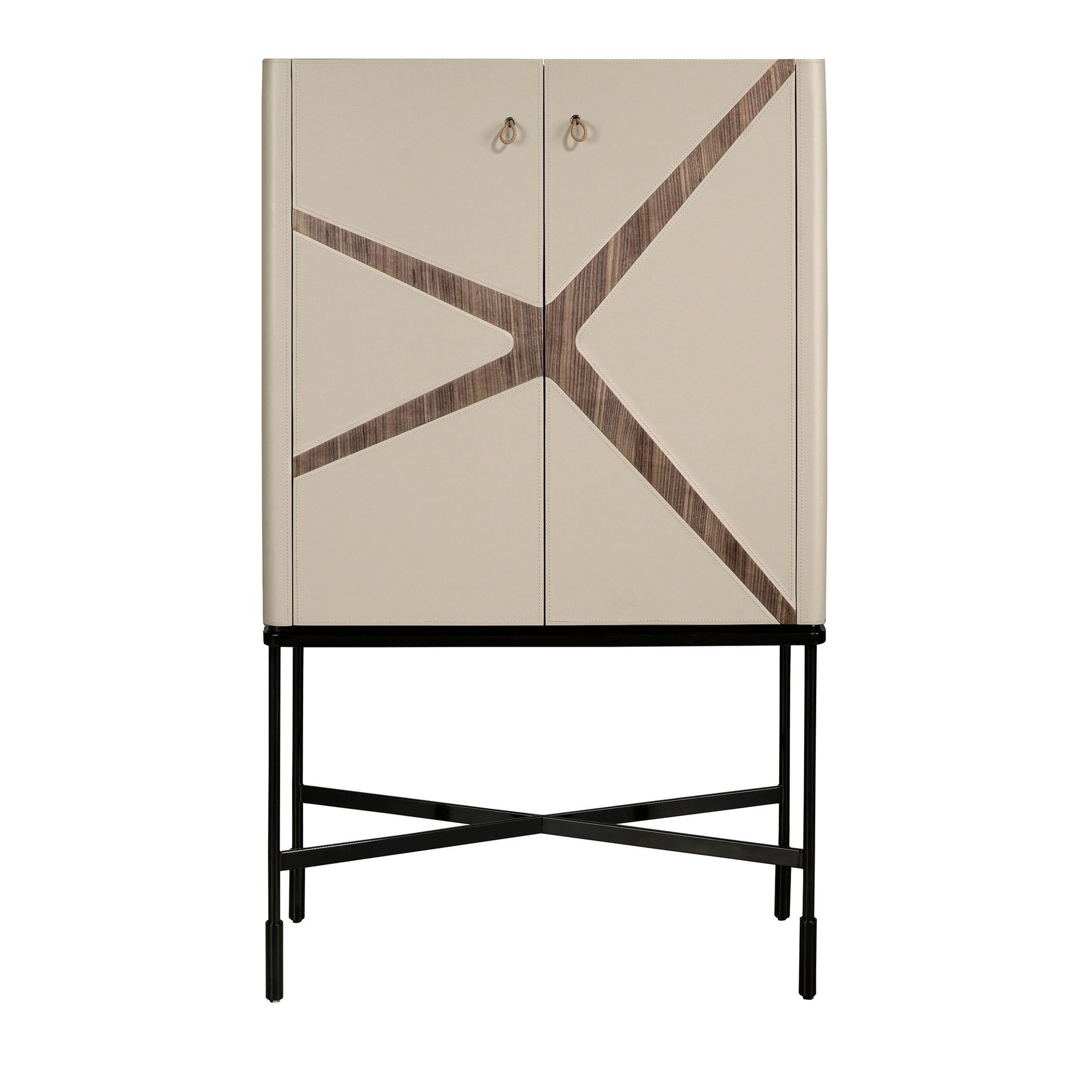 Современный дизайн высокого буфета с натуральной структурой из орехового шпона, обитого кожей цвета норки и оригинальными черными ножками из нержавеющей стали. Имеет большое пространство для хранения с 1 ящиком с системой открывания с помощью язычка и системой плавного закрывания, а также 2 дверцы с системой открывания и закрывания с помощью язычка.