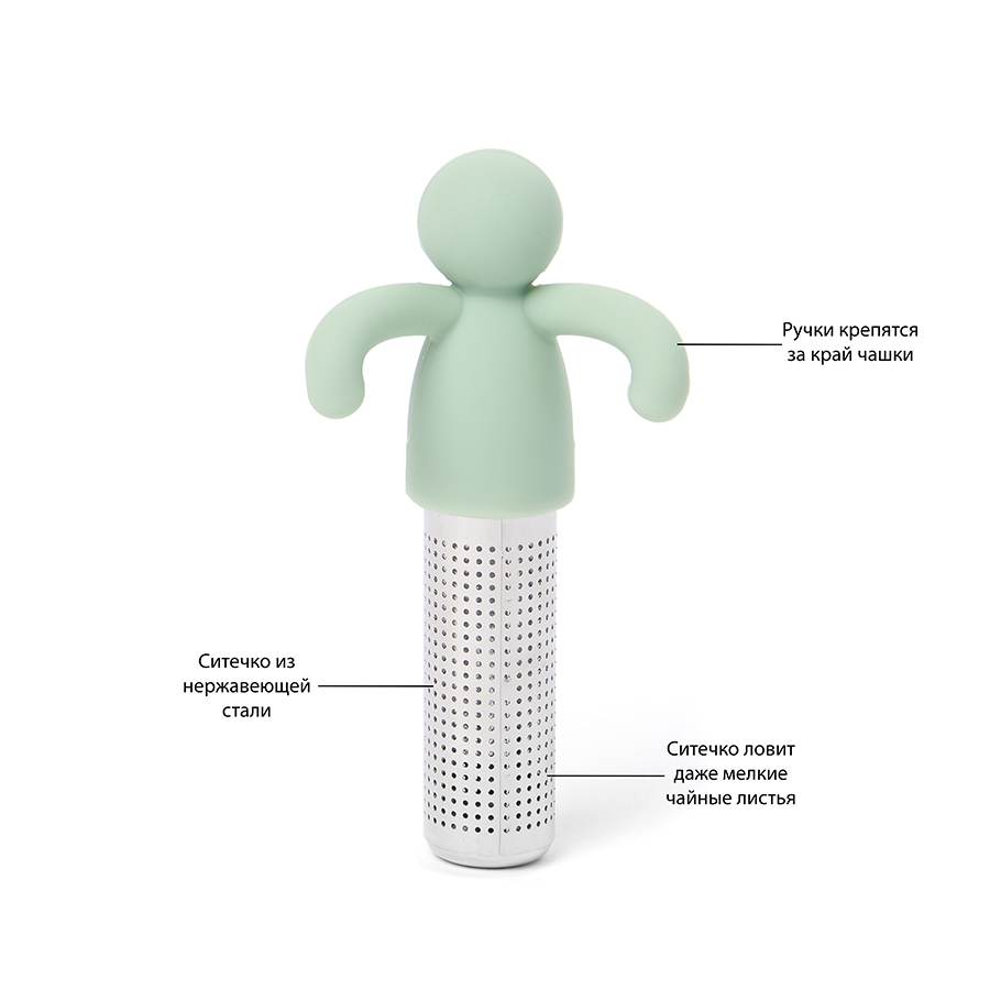 Заваривайте любимый чай сразу в кружке с помощью заварочника «Бадди». Такой забавный человечек развеселит Вас за завтраком и напоит ароматным чаем в считанные минуты его заварив. Благодаря мелкому сетчатому основанию чаинки не высыпятся, но чай получится насыщенным в считанные секунды. Зафиксировать заварник можно благодаря «ручкам» человечка, они легко гнутся в зависимости от формы кружки и прочно закрепляются на ее стенке.