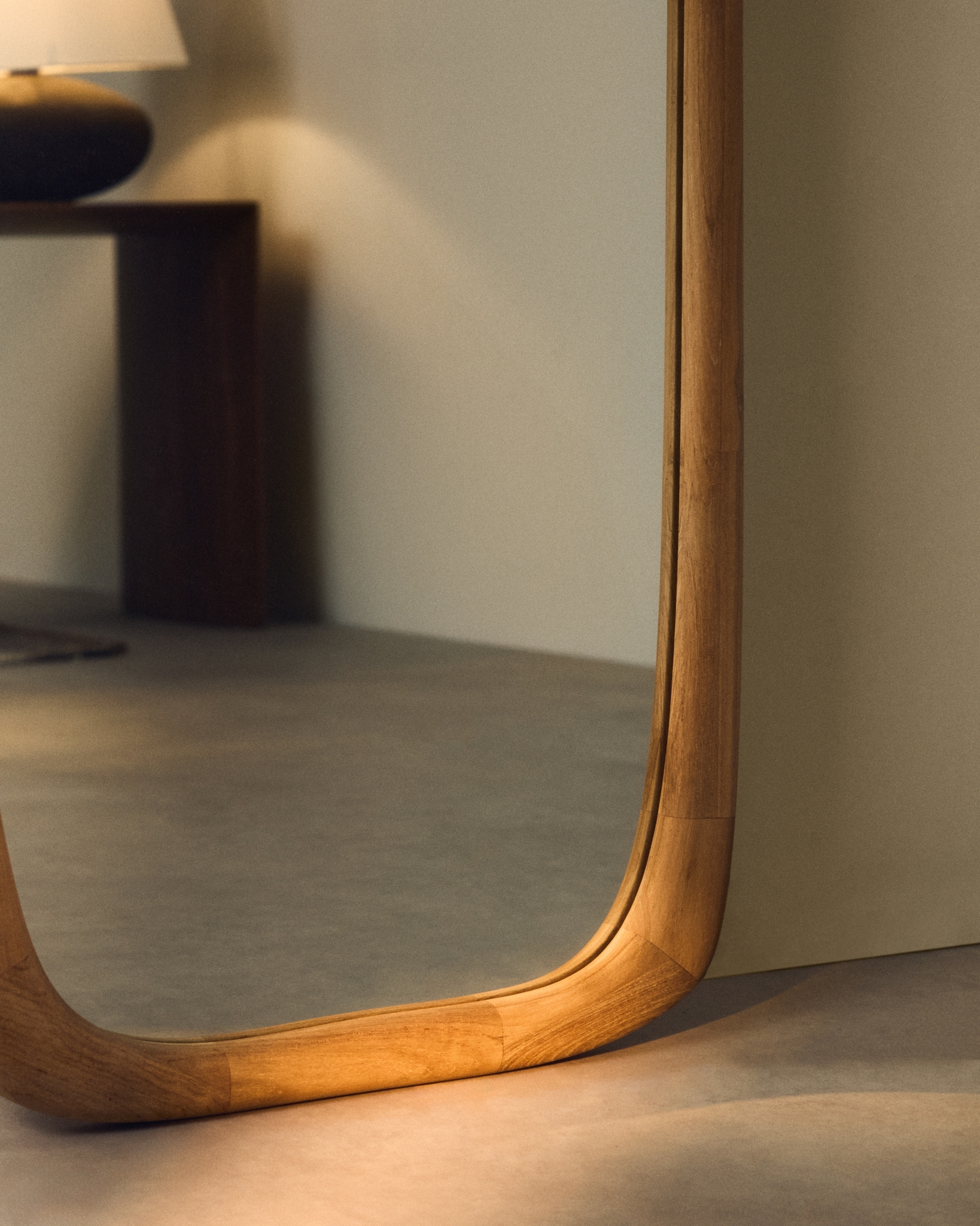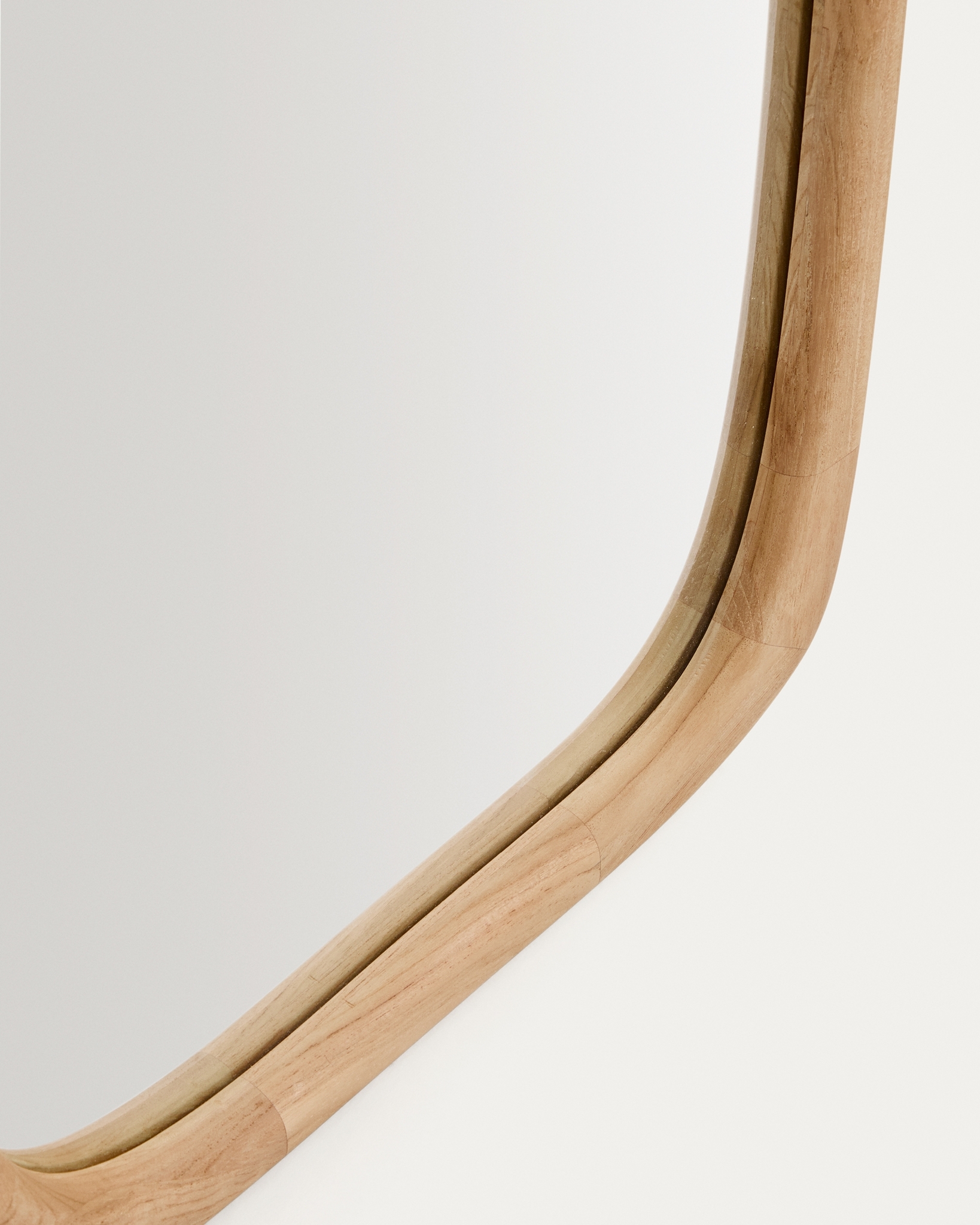 Это зеркало органичной формы из тикового дерева отличается плавным и элегантным дизайном. Его уникальный силуэт придаёт динамичность и индивидуальность любому помещению, превращая его в декоративный элемент, сочетающий в себе функциональность и эстетику. Идеально дополняющее современный или более тёплый интерьер, это зеркало привнесёт индивидуальность и оригинальность в любой уголок дома.