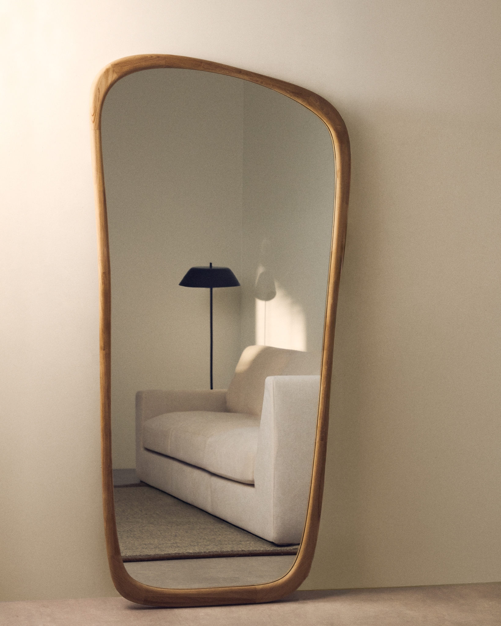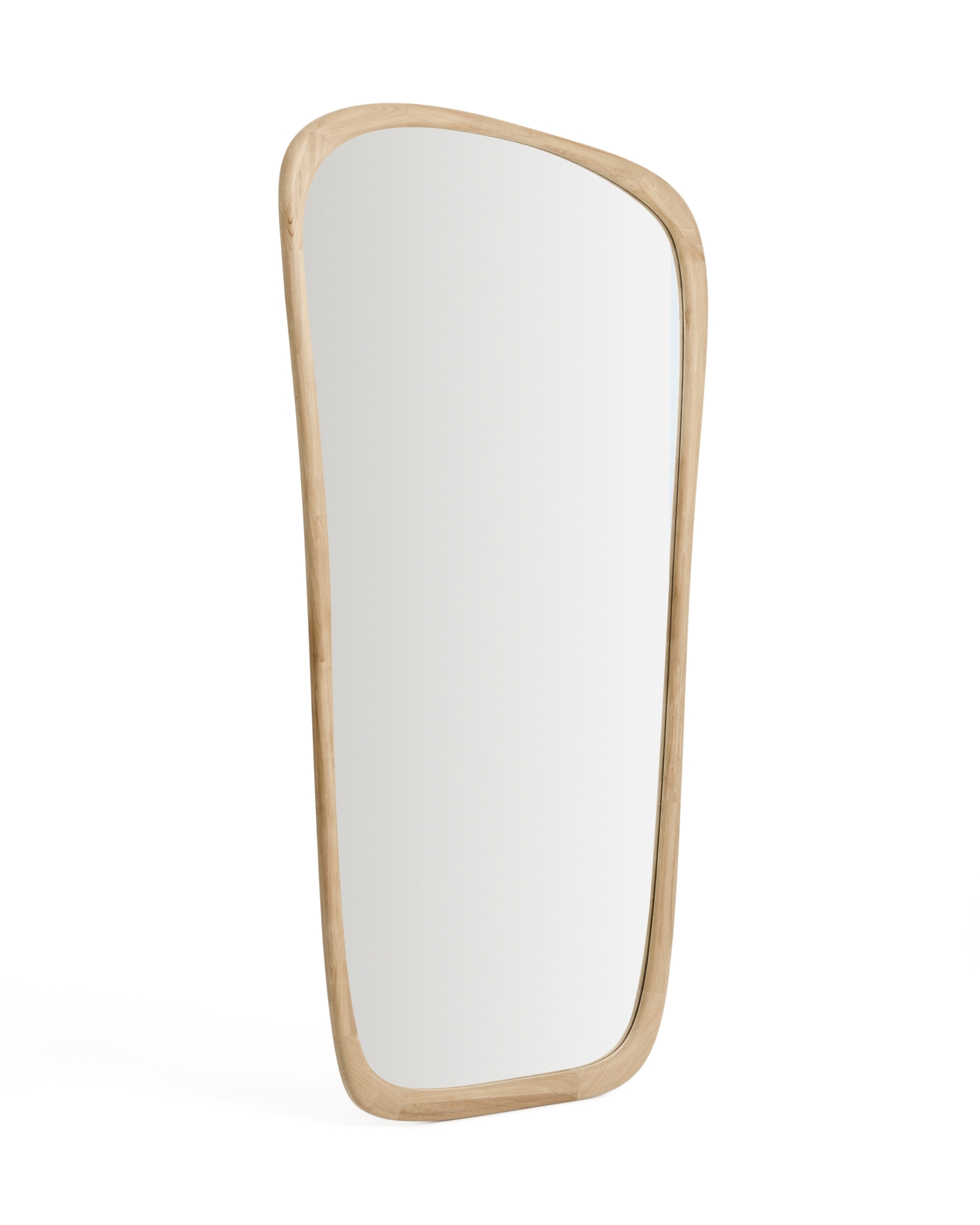 Это зеркало органичной формы из тикового дерева отличается плавным и элегантным дизайном. Его уникальный силуэт придаёт динамичность и индивидуальность любому помещению, превращая его в декоративный элемент, сочетающий в себе функциональность и эстетику. Идеально дополняющее современный или более тёплый интерьер, это зеркало привнесёт индивидуальность и оригинальность в любой уголок дома.