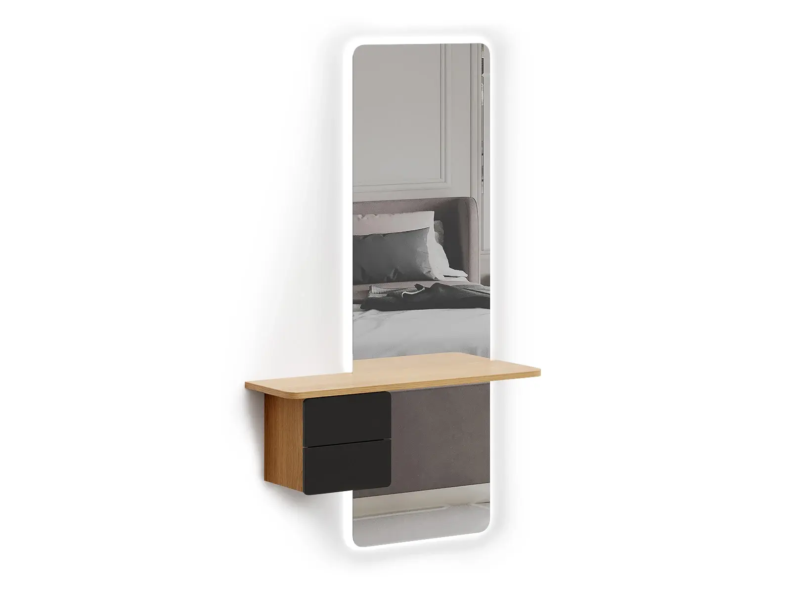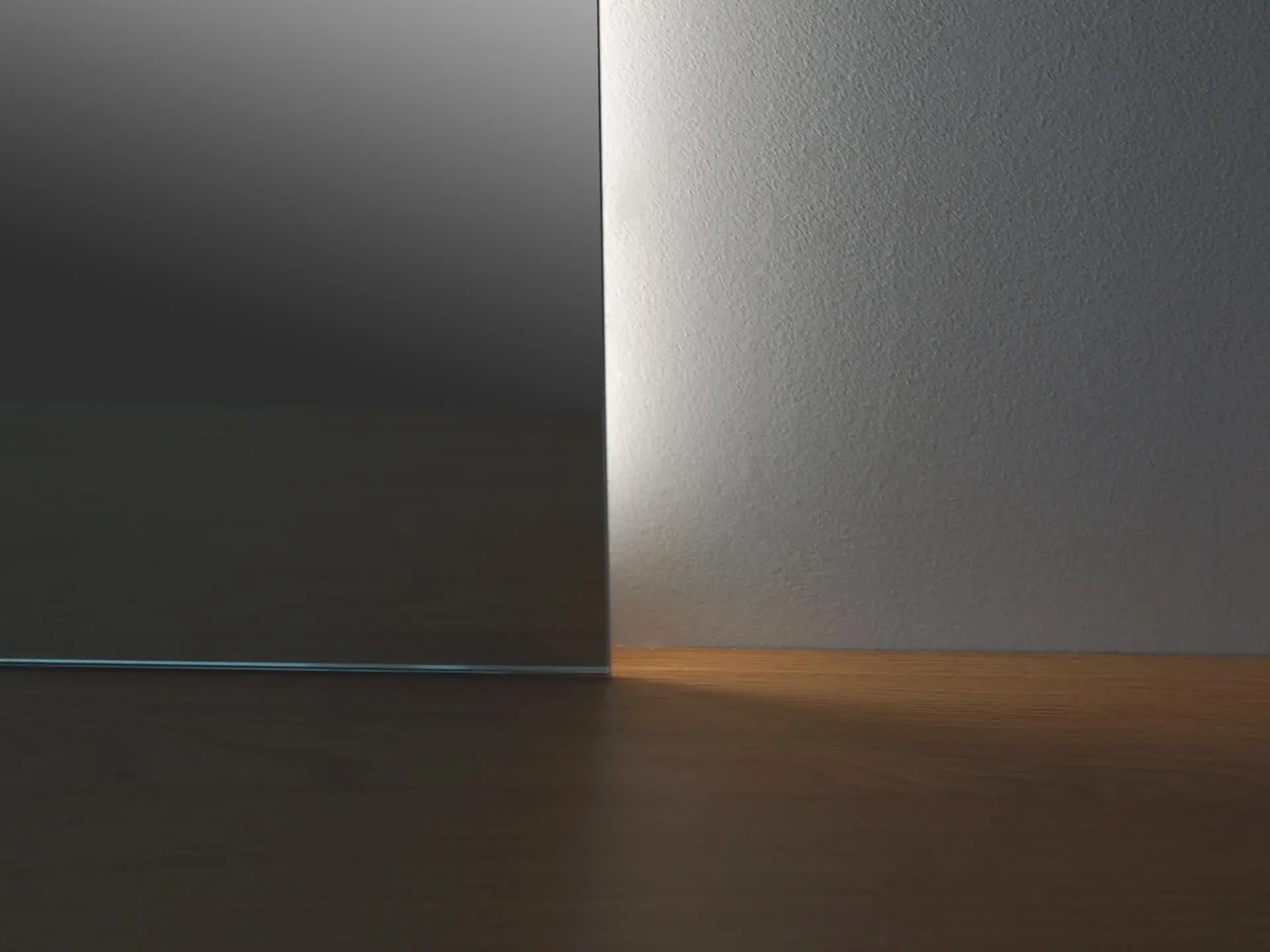 Зеркало с ящиками Mede с подсветкой оснащено светодиодной подсветкой по периметру зеркала. Подсветка представляет собой светодиодную ленту в алюминиевом профиле с рассеивателем. Выключатель располагается на кромке подзеркального щита над столешницей. Выключатель всегда справа. Подсветка комплектуется блоком питания. Разъем для блока питания на кромке подзеркального щита под столешницей справа.