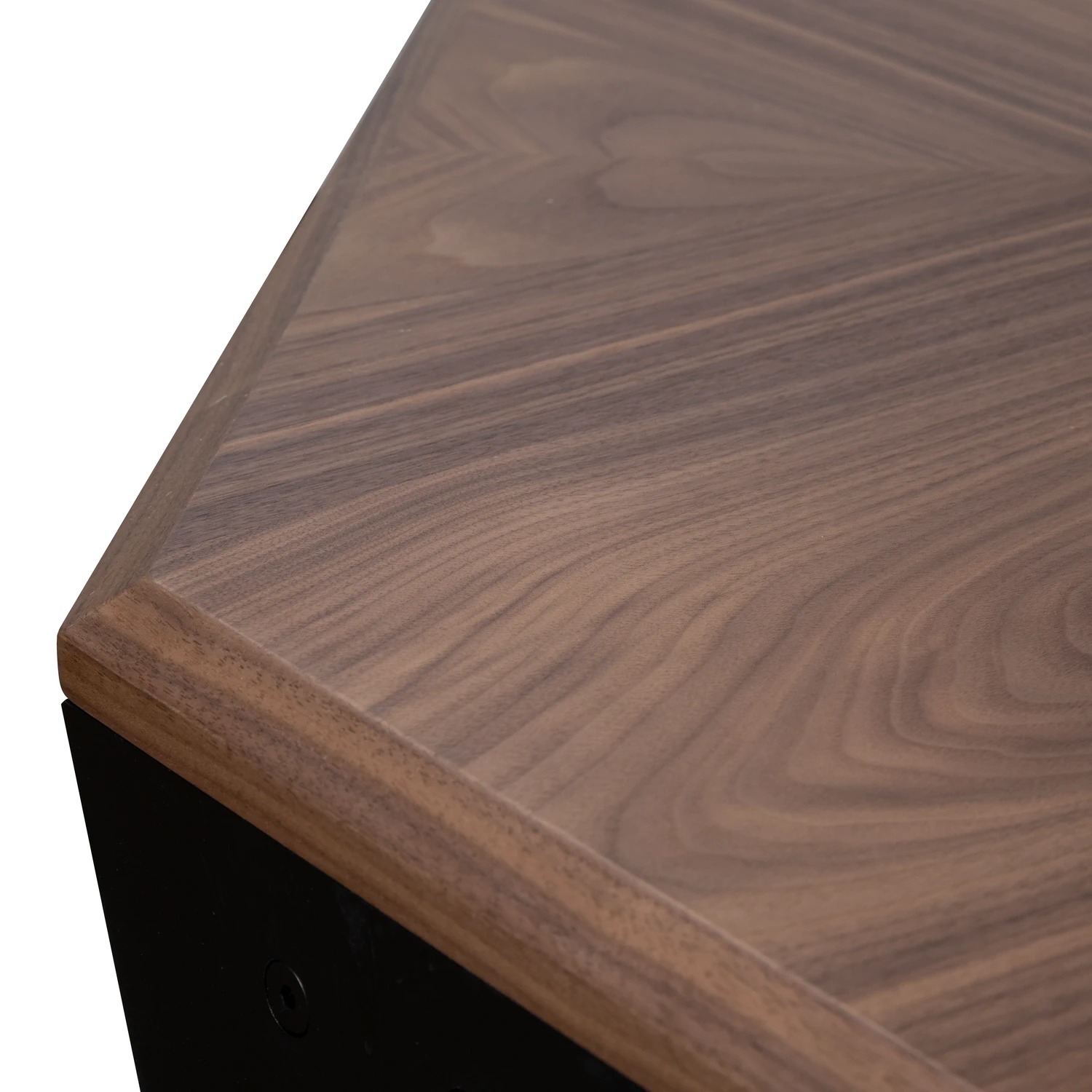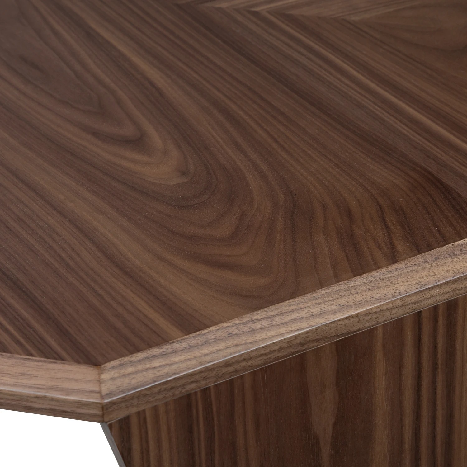 Столешница из МДФ, покрыта натуральным шпоном ореха. Благородный рисунок древесины подчеркивает геометрию стола, создавая игру природных линий. Оттенок — тёплый орех с характерными переливами от медово-коричневого до глубокого шоколадного*.